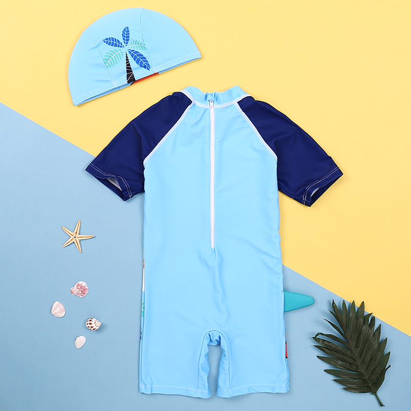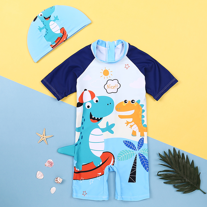儿童泳衣男童可爱连体防晒速干宝宝婴儿小中童游泳衣男孩套装泳帽