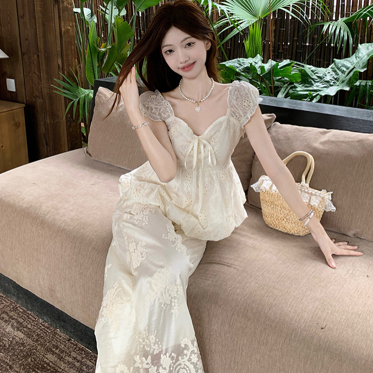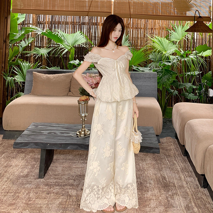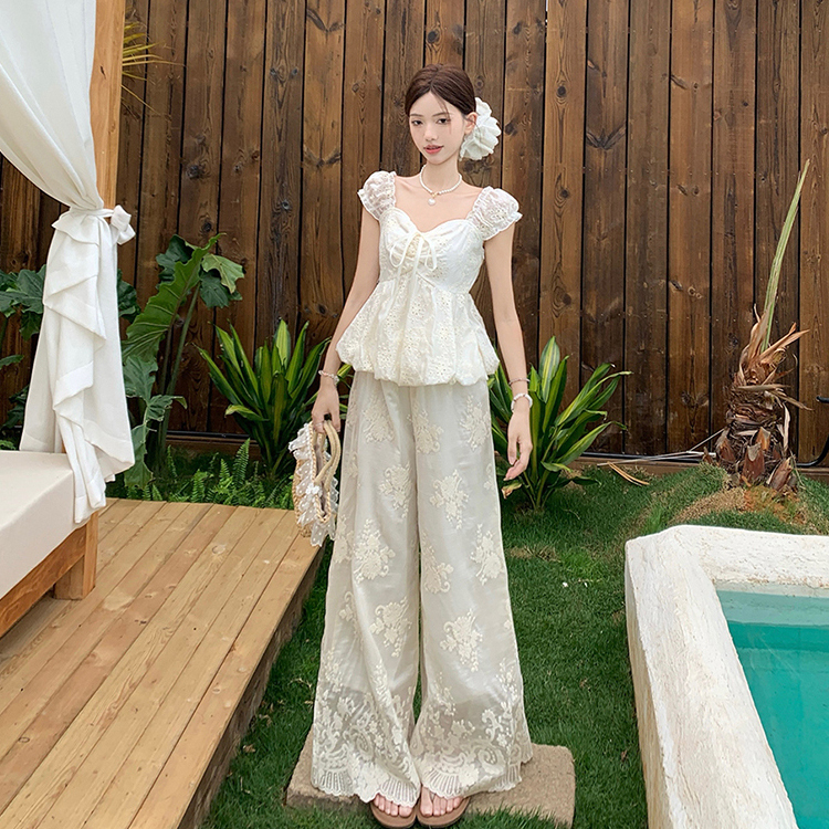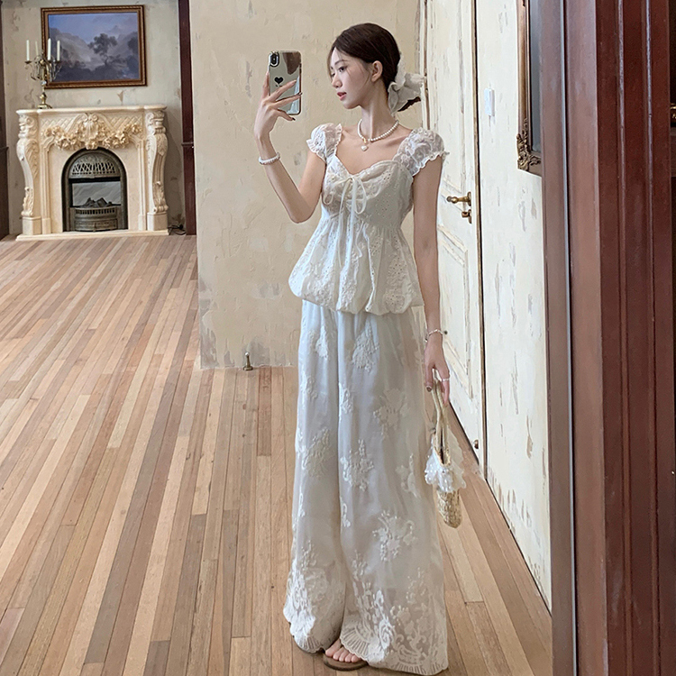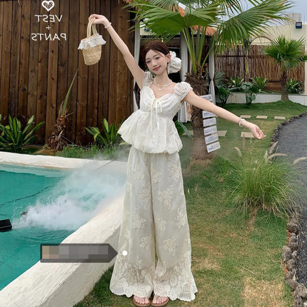 200斤大码女装胖mm法式显瘦花苞蕾丝衫高腰阔腿休闲长裤时尚套装