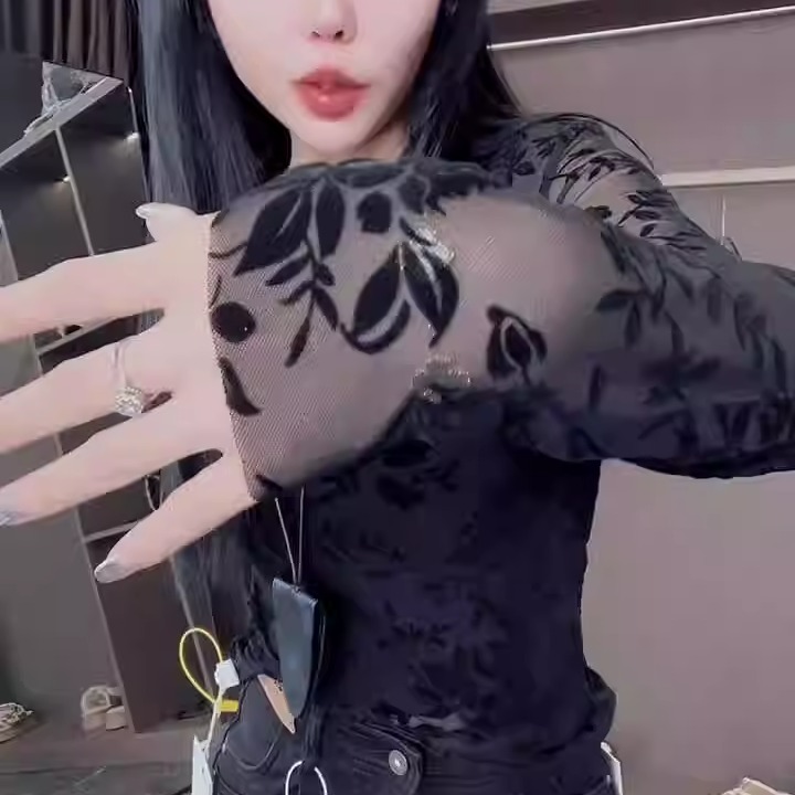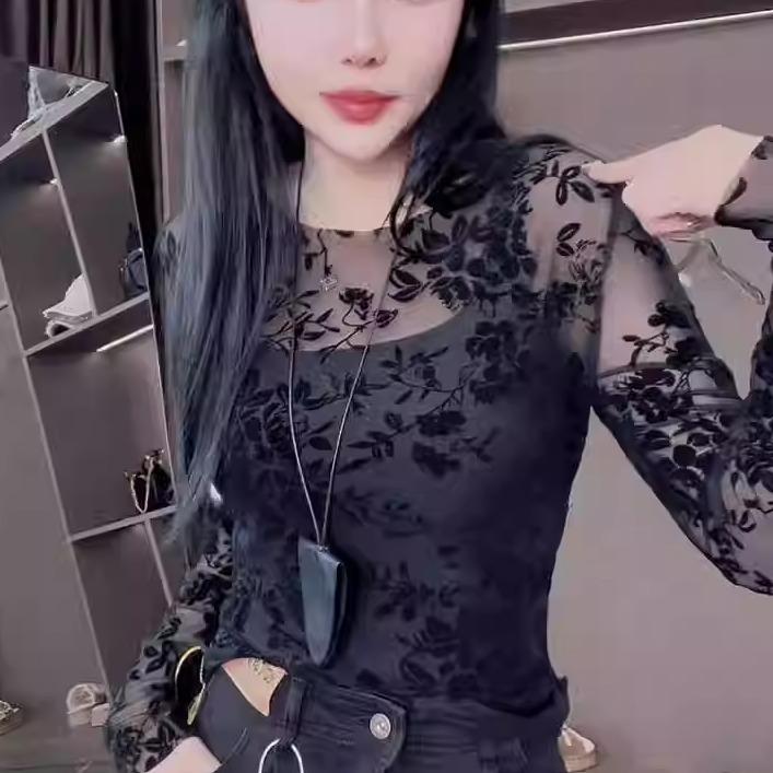 2025秋季新款薄款性感蕾丝长袖T恤女内搭打底衫网纱植绒黑色上衣