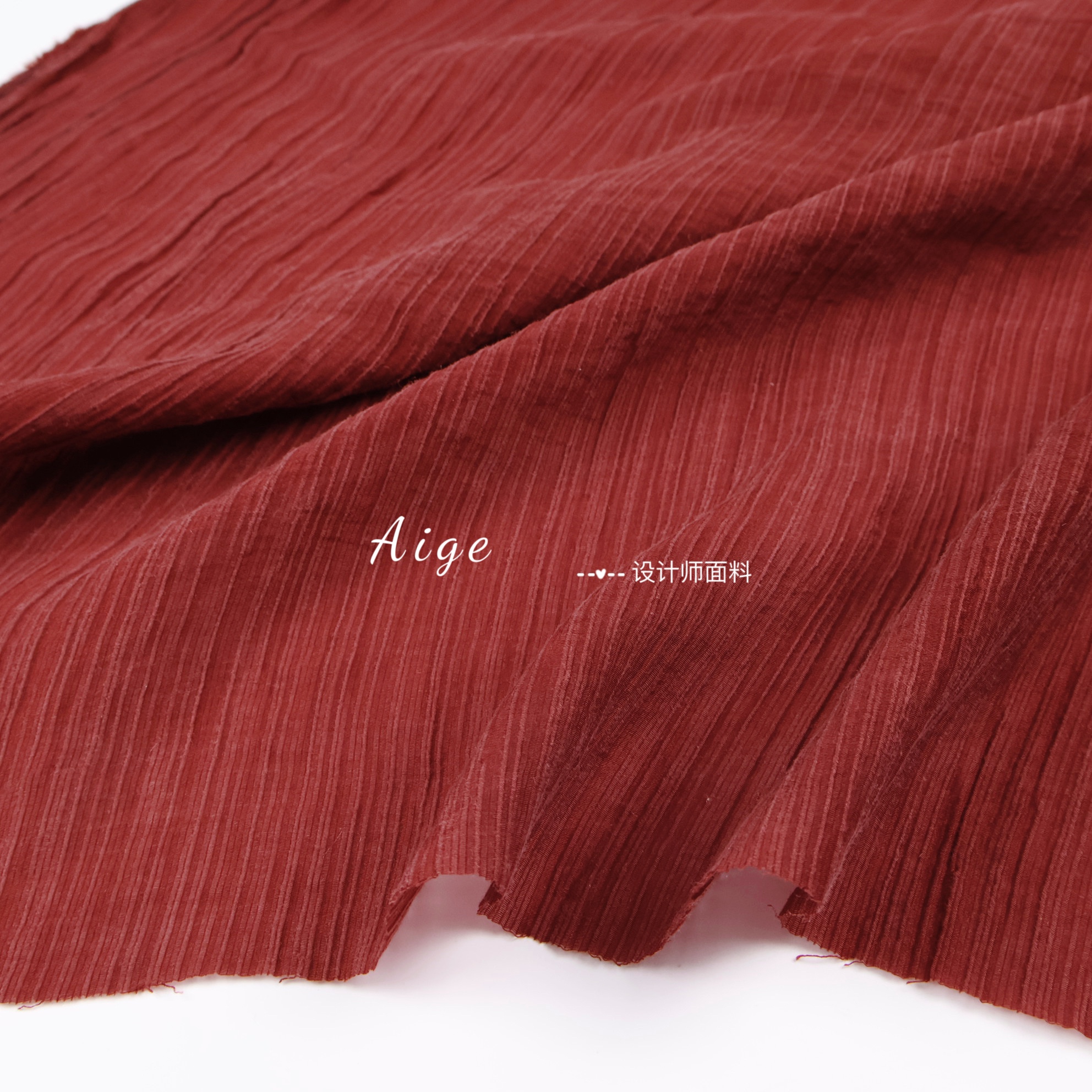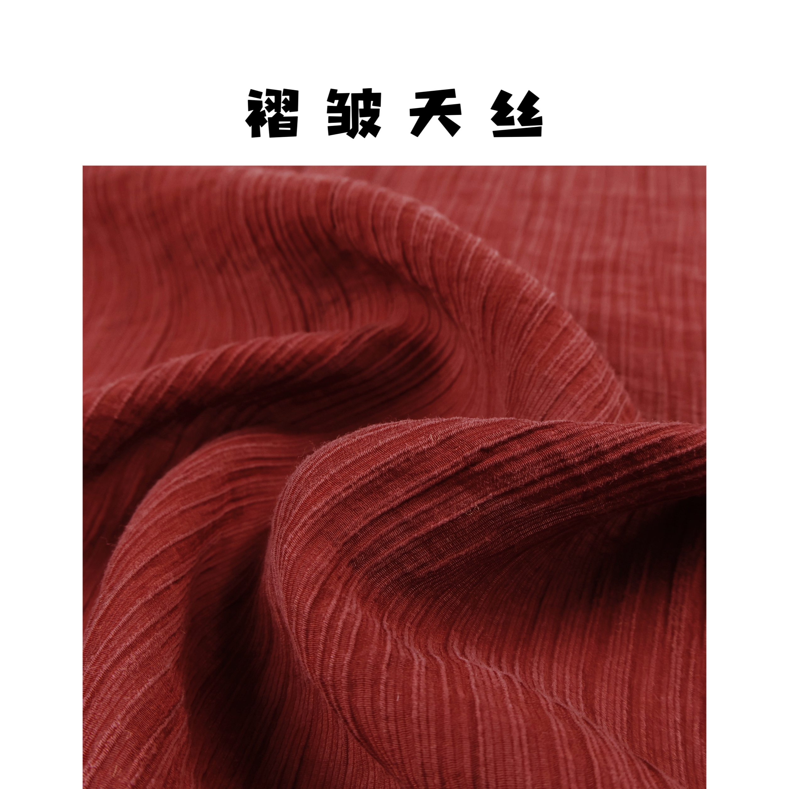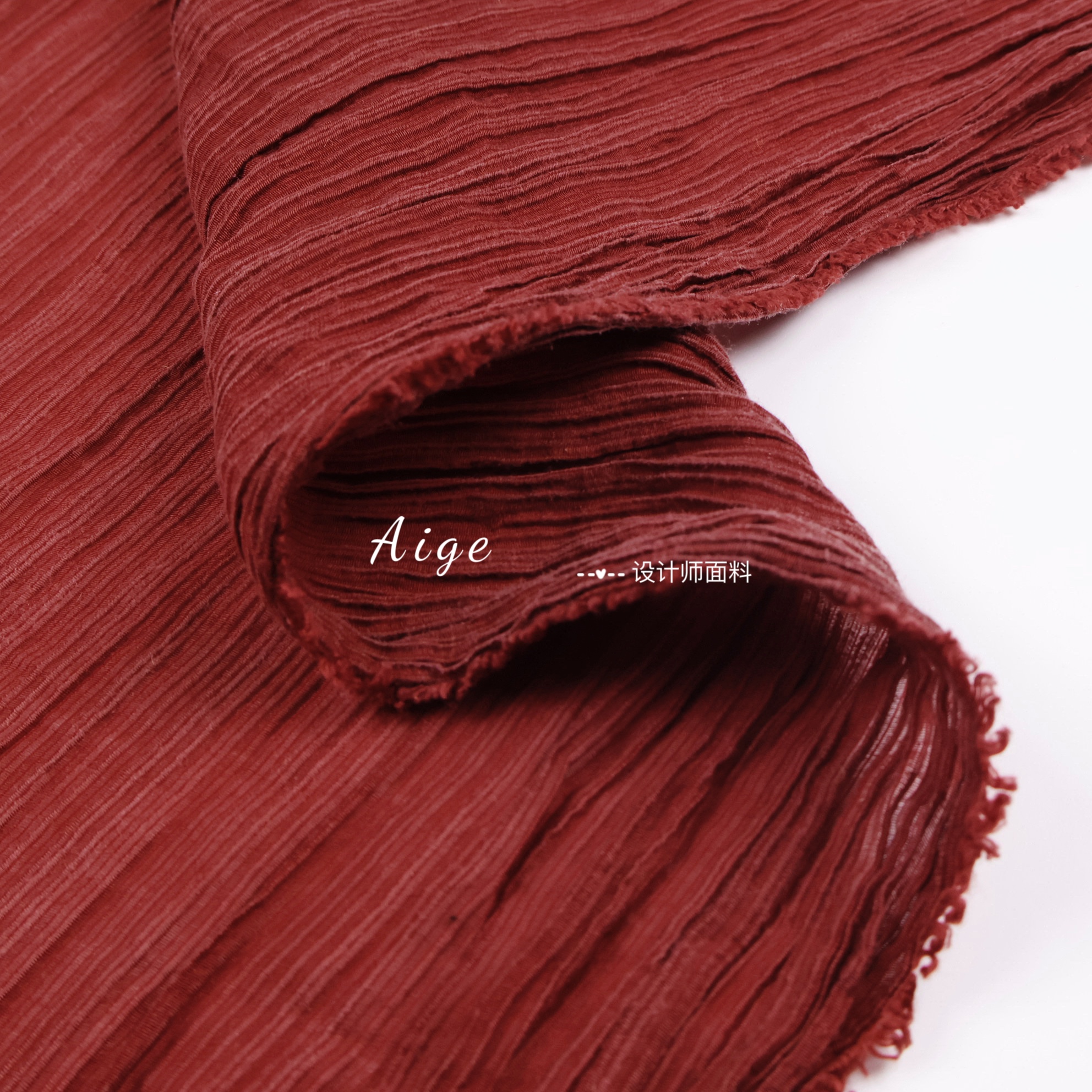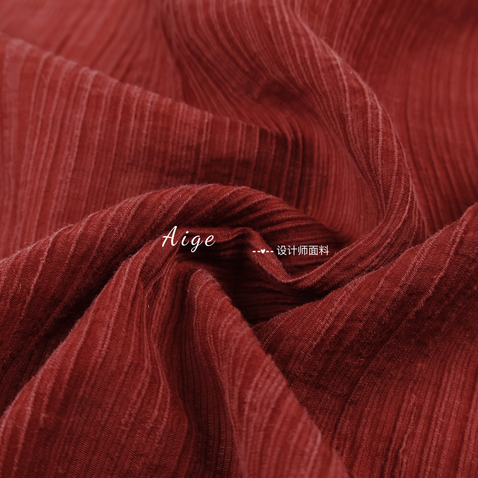 垂感亲肤 做旧红色竖纹褶皱铜氨丝天丝麻棉麻面料衬衫连衣裙布料