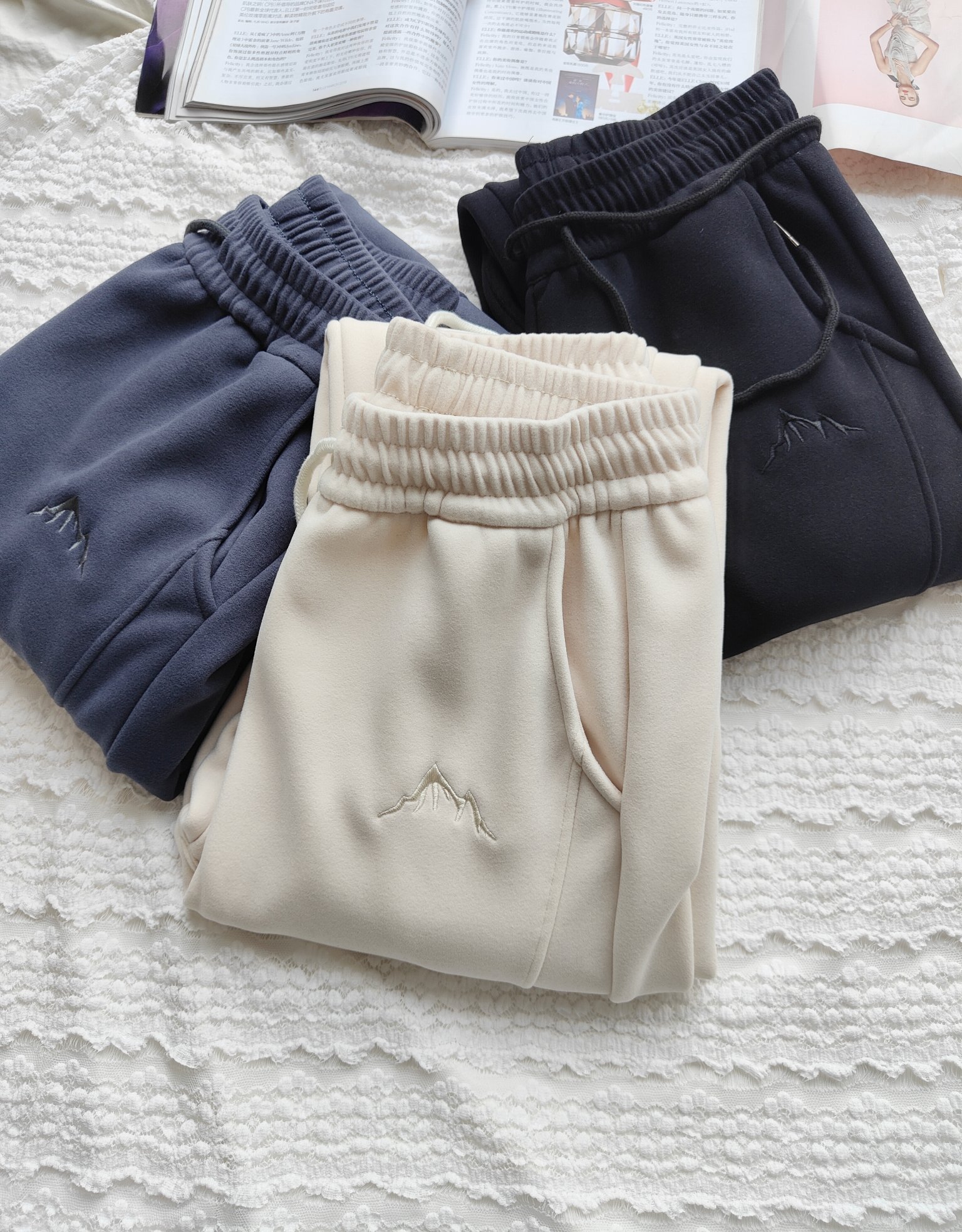 奕薇山茶花情侣防风裤百搭哈伦小脚显瘦柔软透气磨毛加绒束脚运动