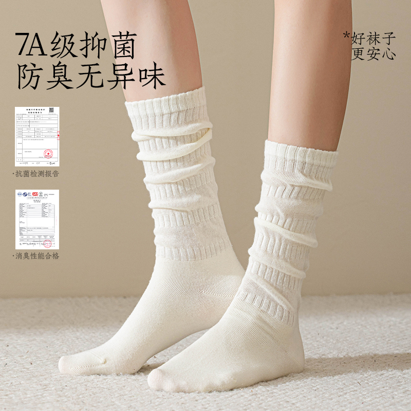 袜子女秋冬季中筒袜纯棉防臭抗菌100%棉堆堆袜白色无骨长筒袜女生