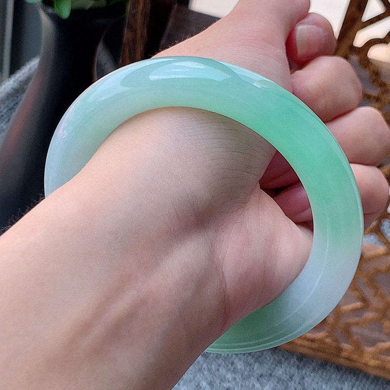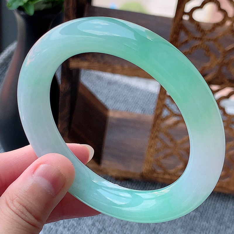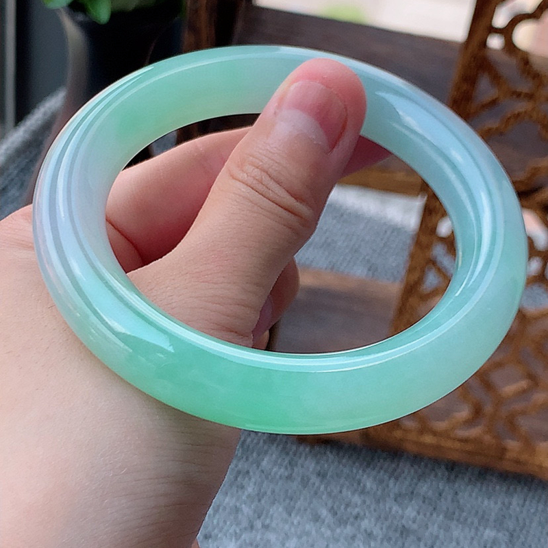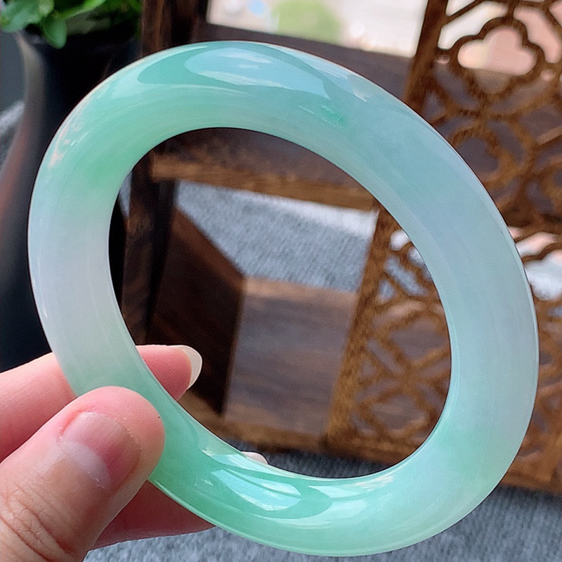 缅甸A货天然翡翠 老坑冰种飘绿圆条手镯58-59圈口