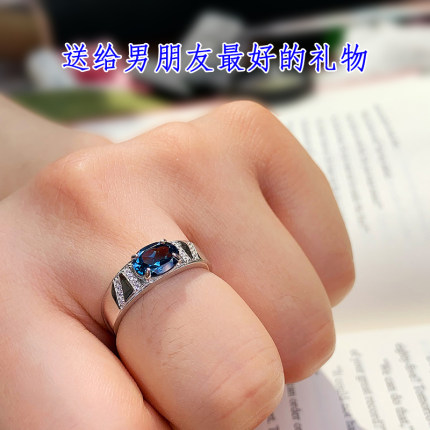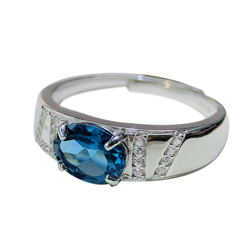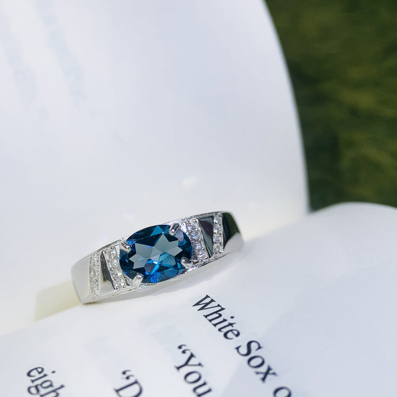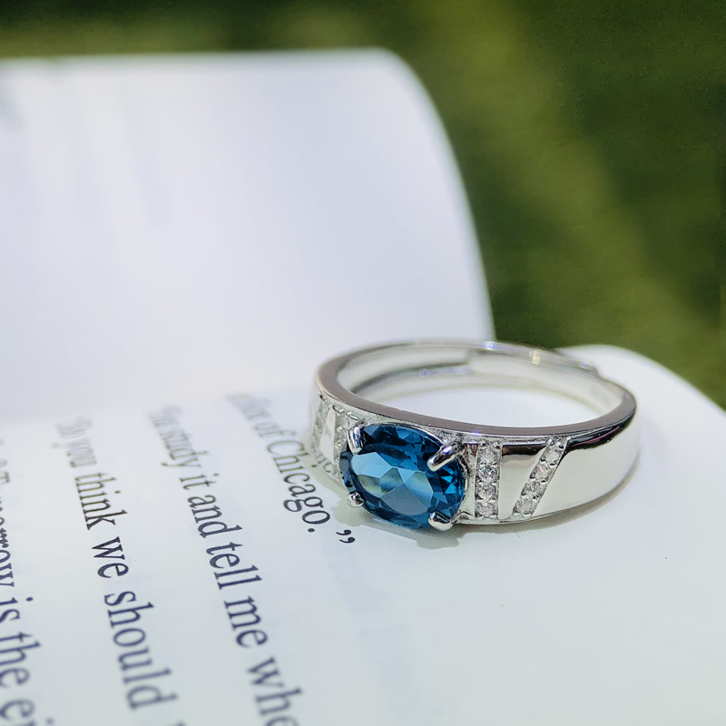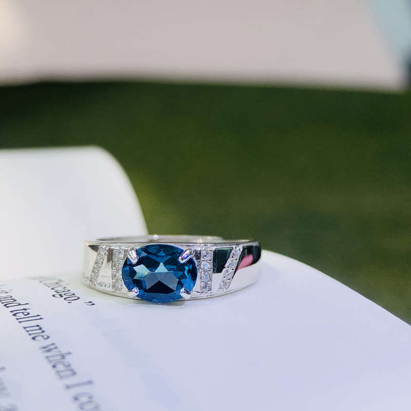 天然蓝宝石色伦敦蓝托帕石戒指男S925纯银男戒霸气高档戒子证书