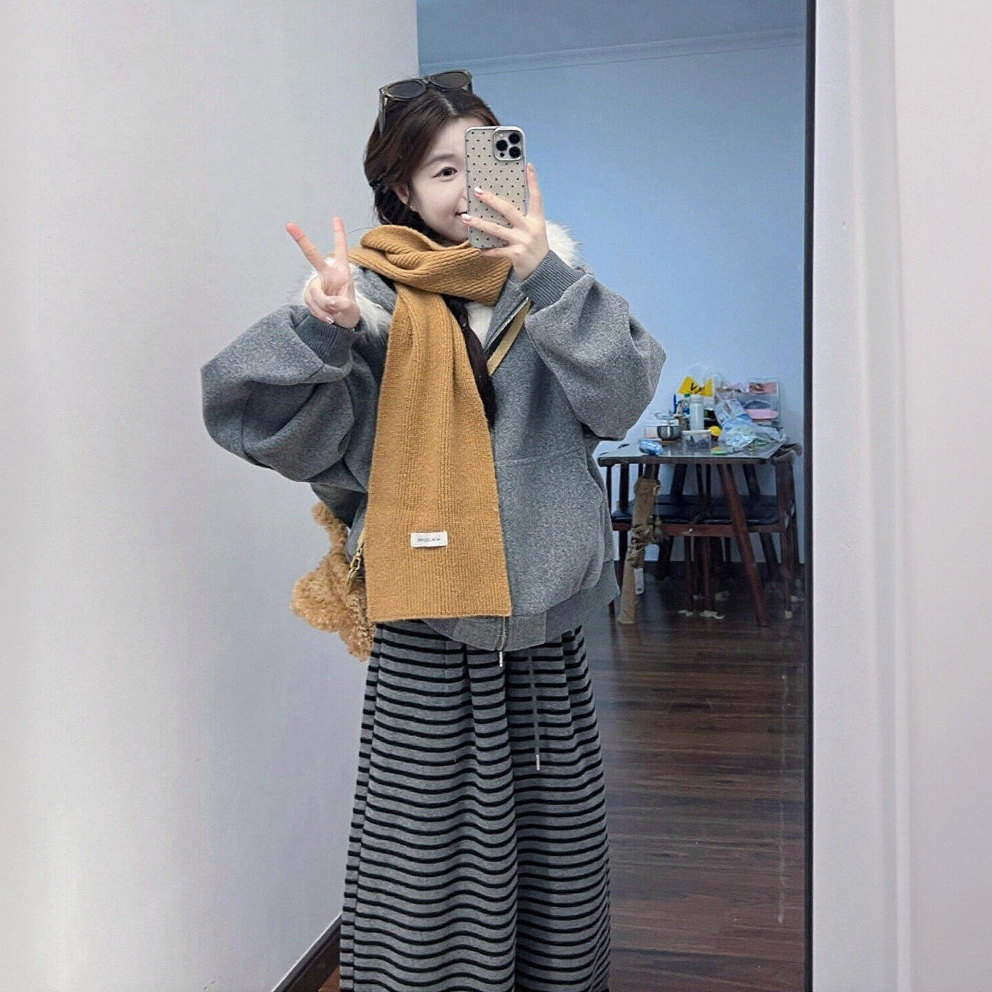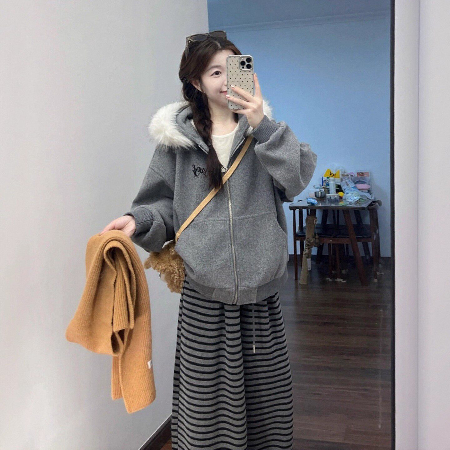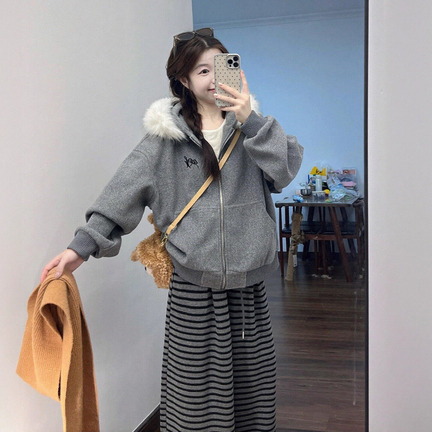 巨好看的冬装一整套女韩系穿搭慵懒风毛领卫衣外套条纹阔腿裤套装