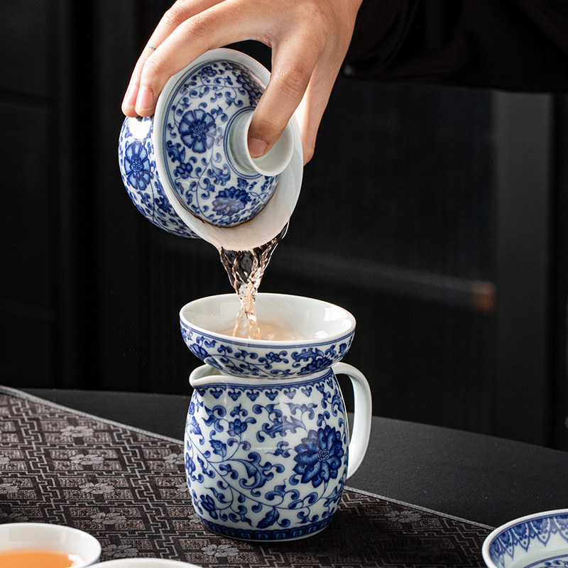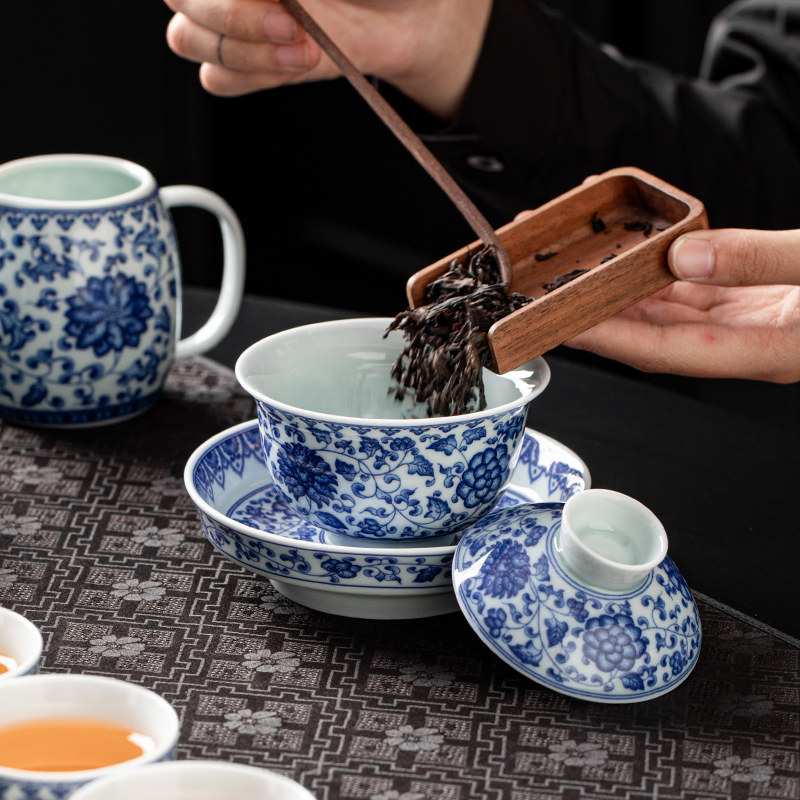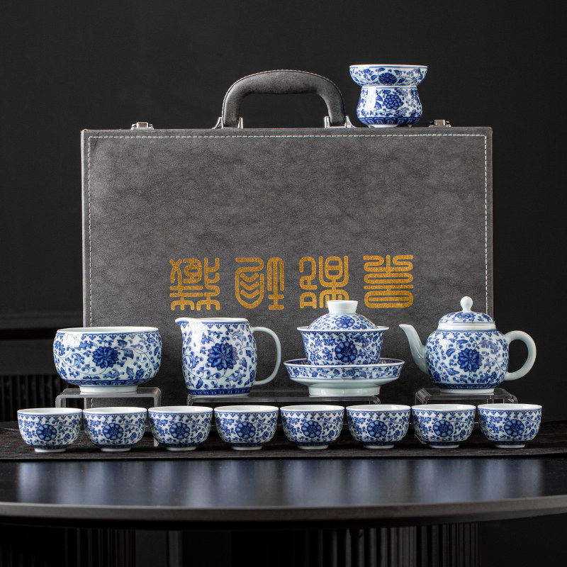 一整套高端青花瓷功夫茶具套装盖碗茶壶茶杯套组家用缠枝莲景德镇