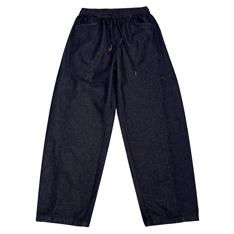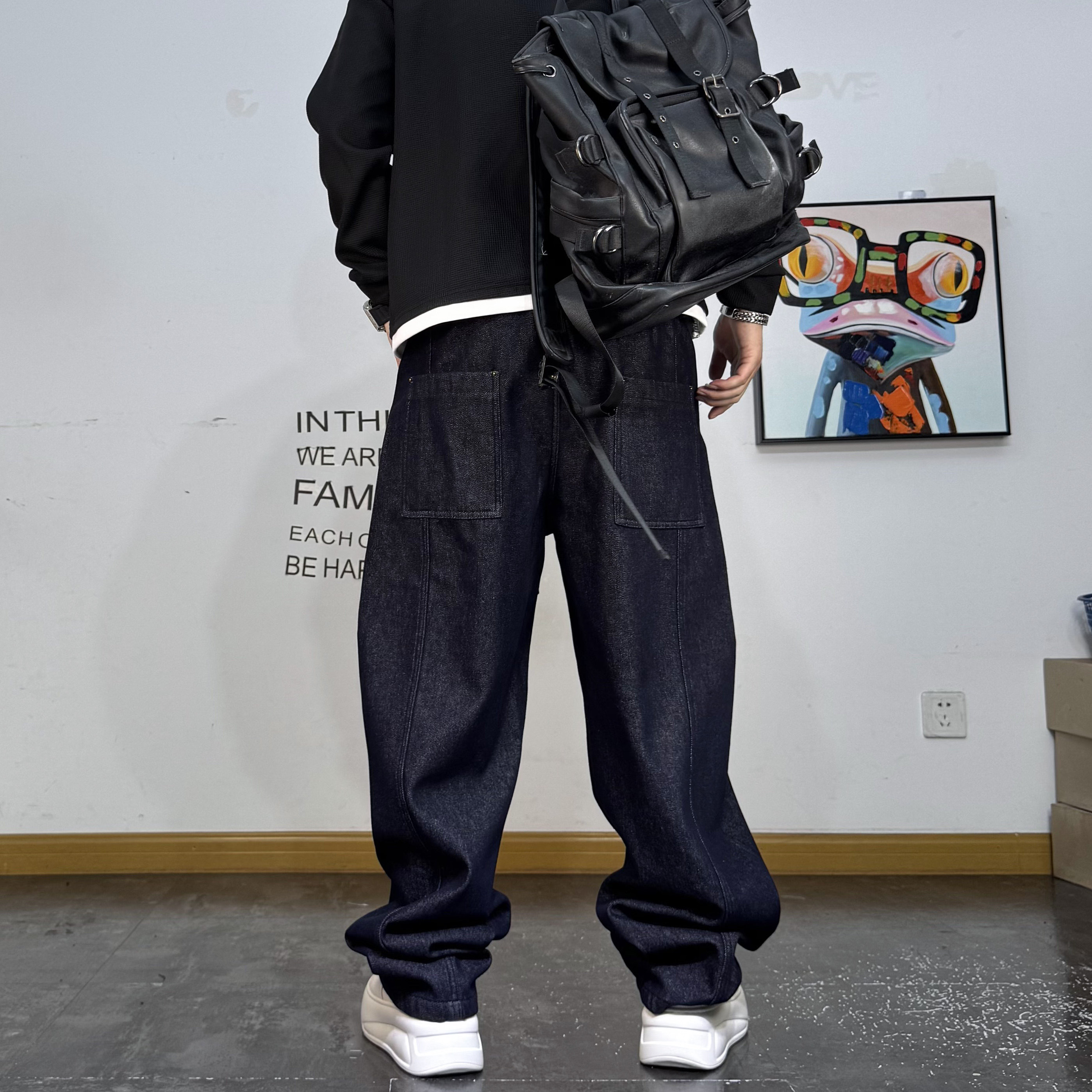 复古深蓝水洗做旧牛仔裤男士加绒保暖耐磨大裆弹力抽绳宽松直筒裤