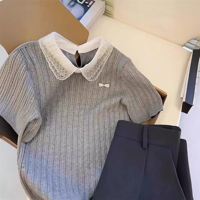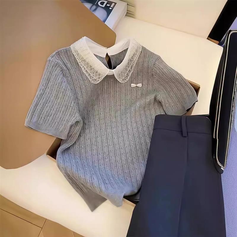 灰色蕾丝娃娃领正肩短袖t恤女夏季polo领拼接短款冰丝针织衫上衣