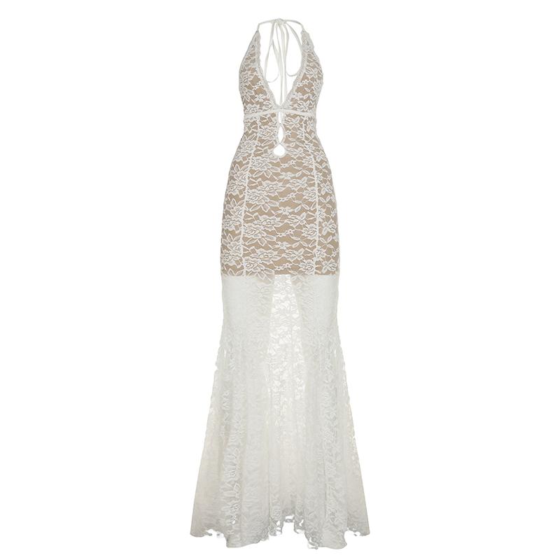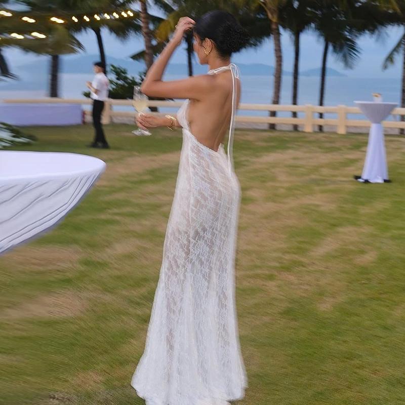 SEEYOULATER 性感度假风镂空挂脖蕾丝吊带长裙简约气质露背连衣裙