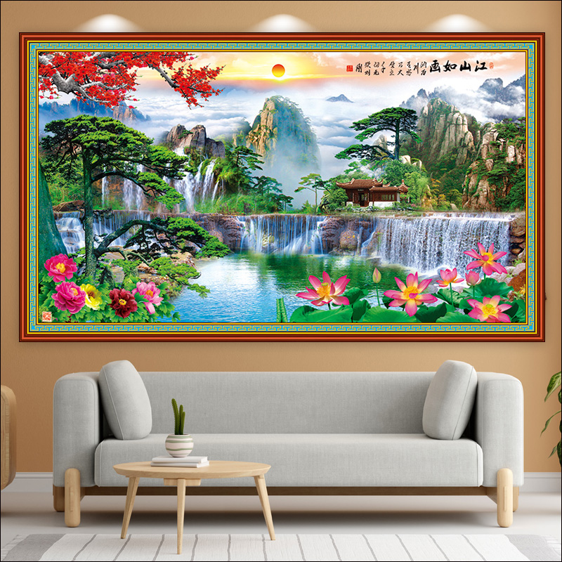 迎客松瀑布流水生财山水风景画装饰画客厅沙发墙画年画荷花鲤鱼