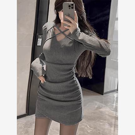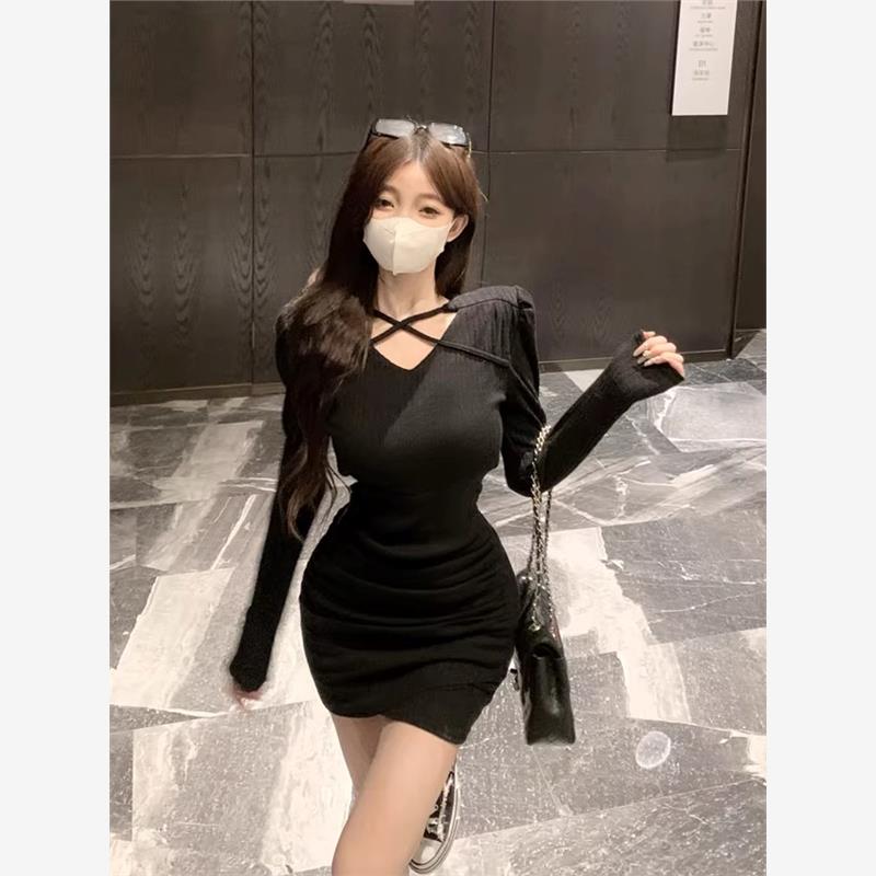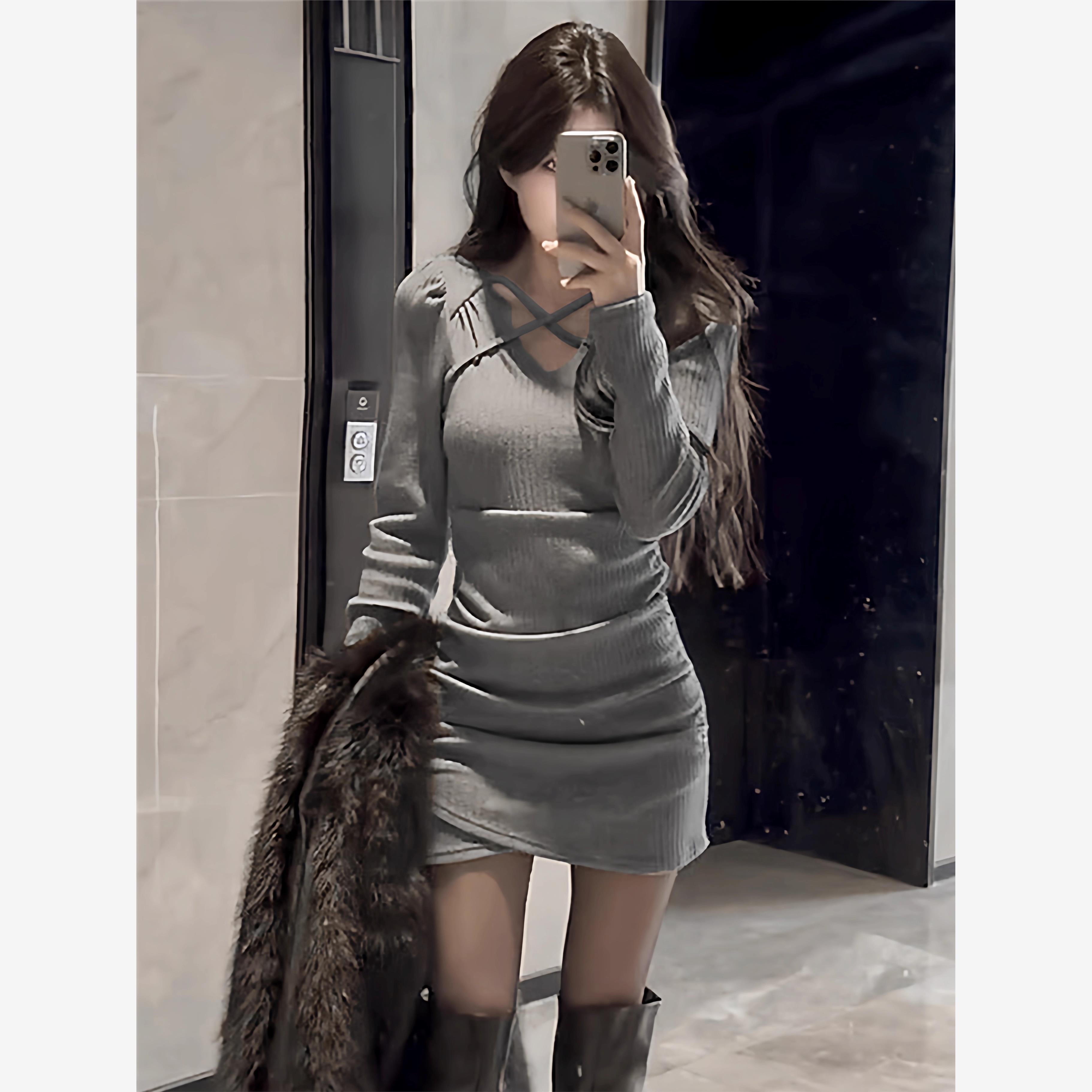 纯欲辣妹风V领长袖连衣裙女秋冬高级感大衣内搭气质打底包臀短裙