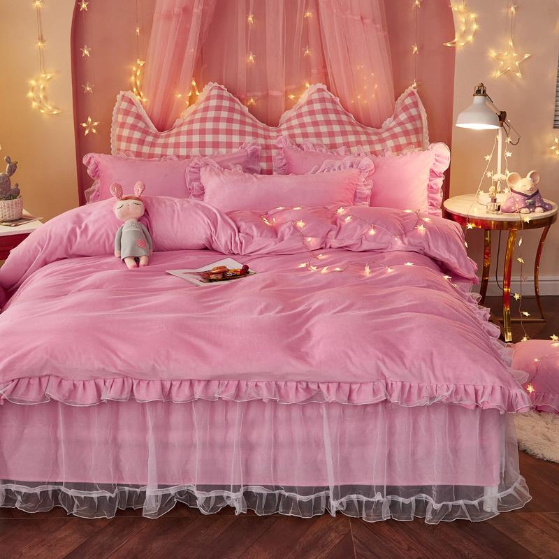 2024粉色少女心牛奶绒四件套公主风蕾丝加厚珊瑚宝宝绒被套床裙款