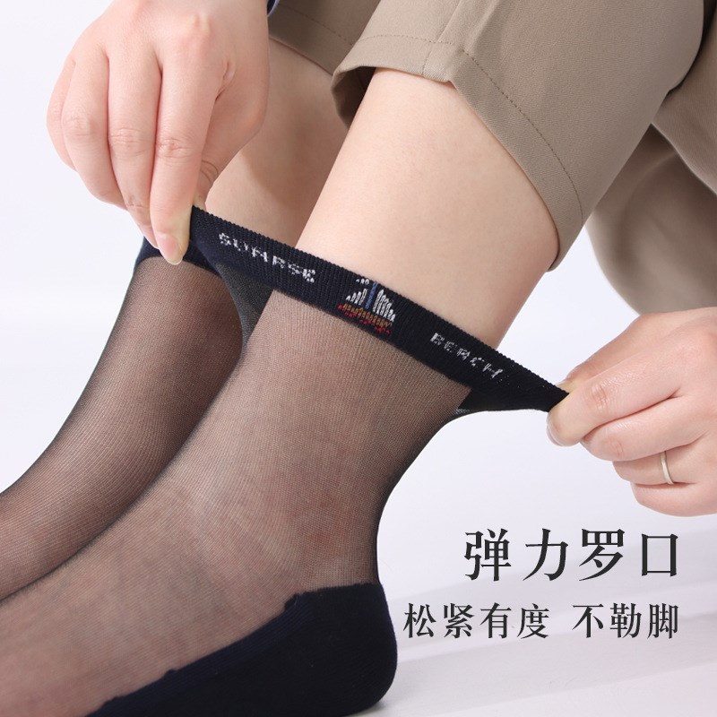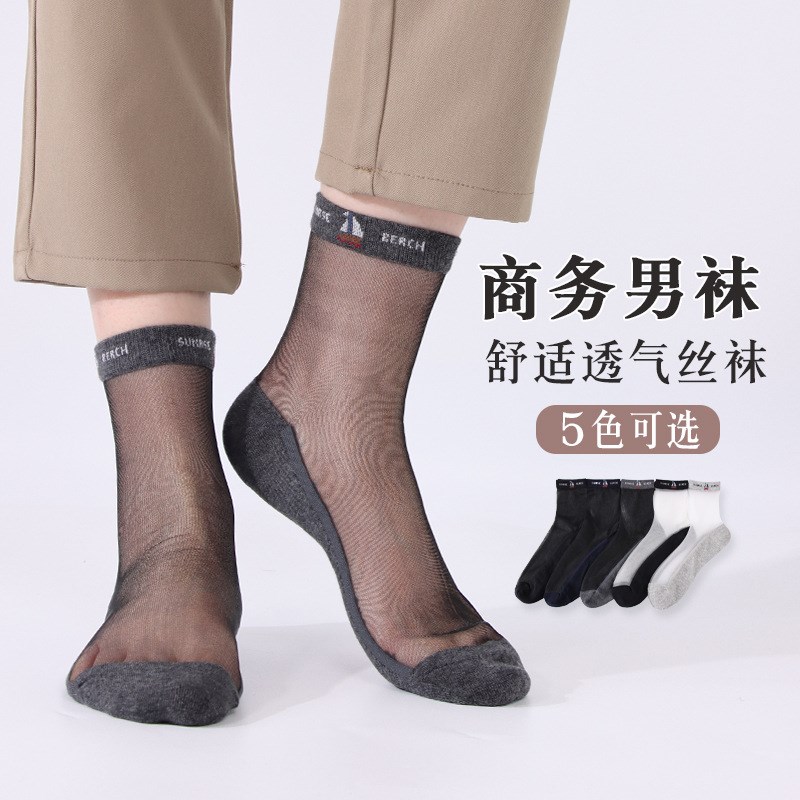 袜子男春夏薄款纯棉底男丝袜防滑吸汗玻璃丝中筒袜透明水晶丝男袜