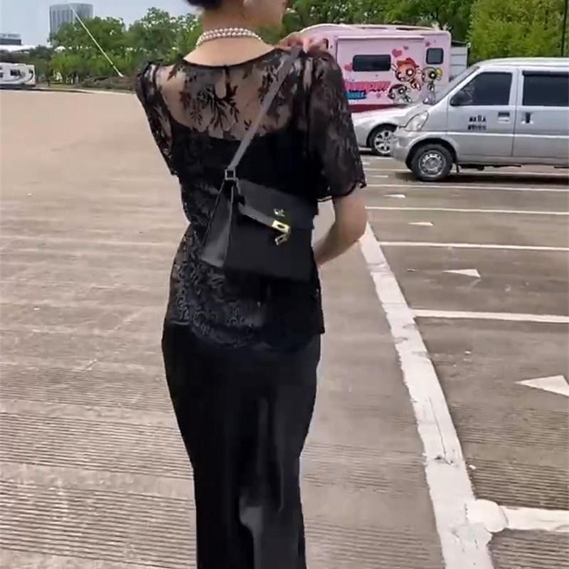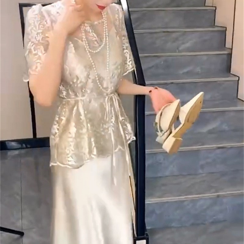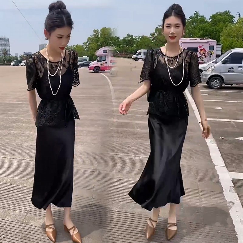 气质时尚套装女24夏季设计感微透蕾丝短袖上衣+吊带连衣裙两件套