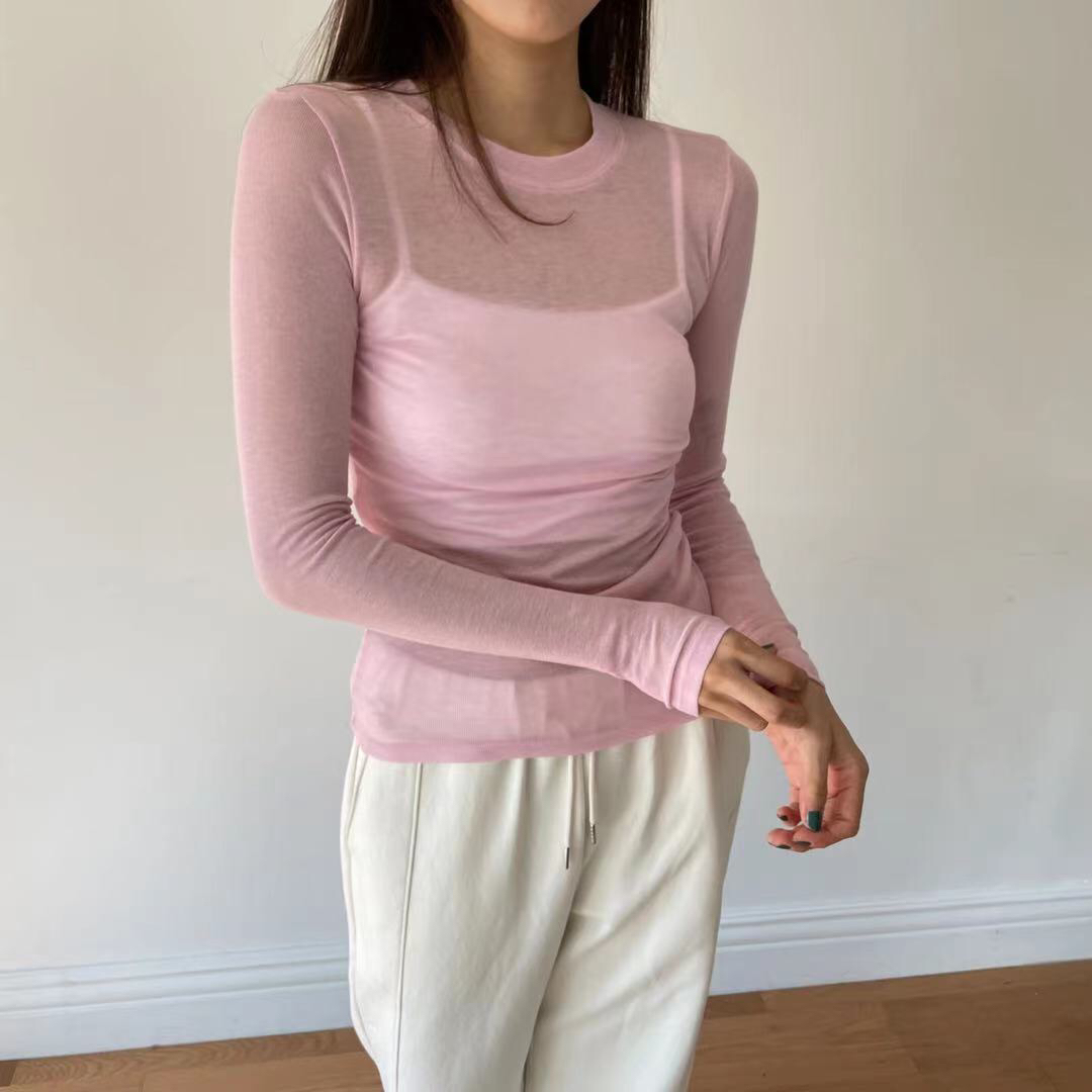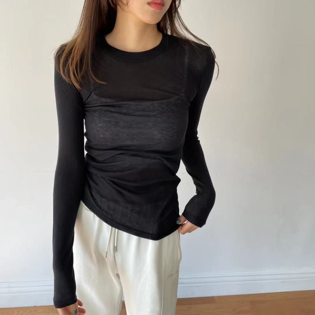 现货TALK TALK韩国东大门女装春秋季圆领背缝线薄透长袖打底衫T恤