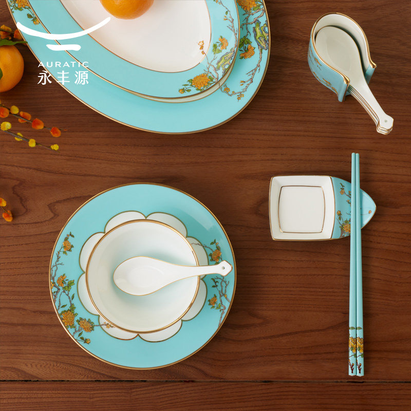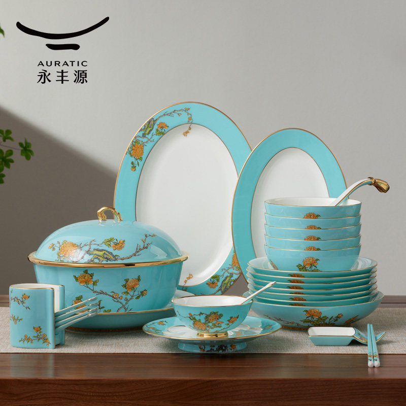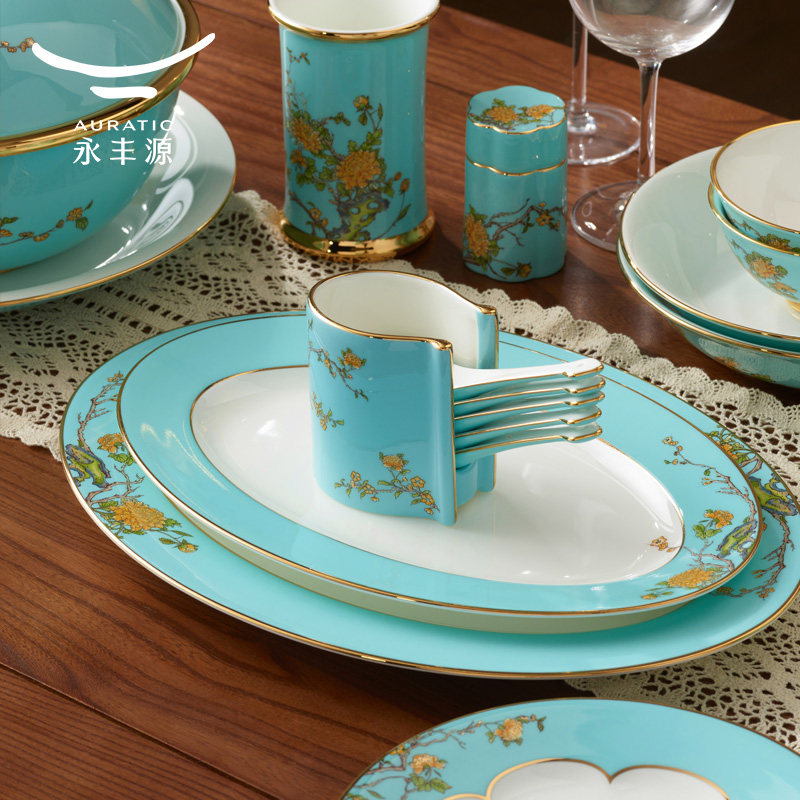 国瓷永丰源夫人瓷西湖蓝91头10人位陶瓷器餐具套装豪家宴会所餐具
