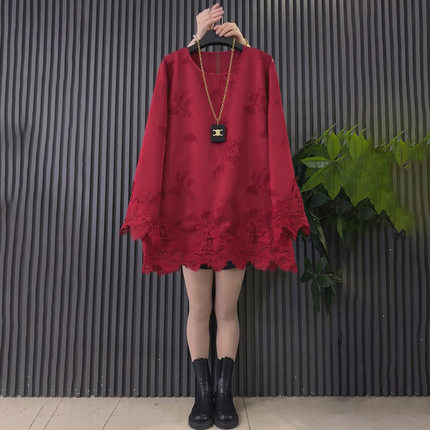 胖MM2026春季新款提花拼接蕾丝花边长袖大衫大码女装宽松显瘦上衣