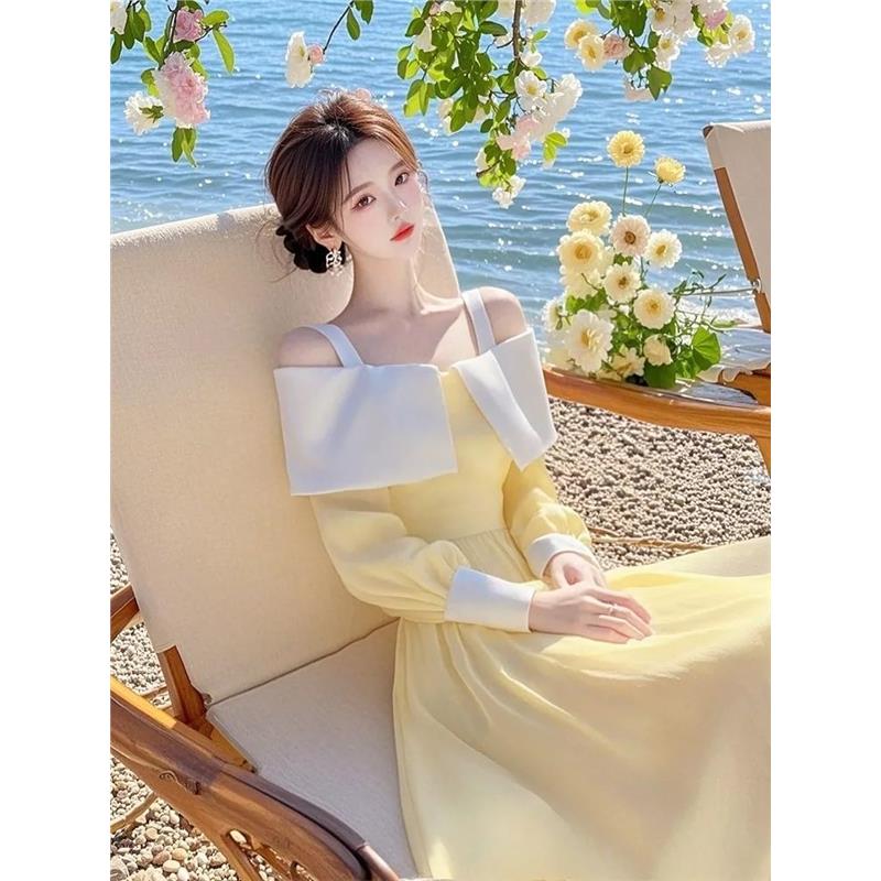 2025春季新款多巴胺掐腰裙法式气质高级感海边度假黄色雪纺连衣裙
