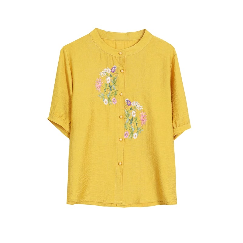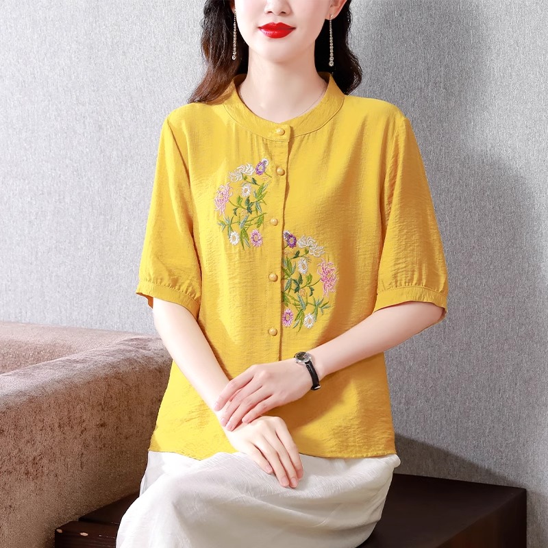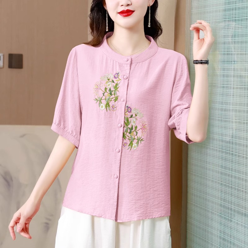 绣花棉麻中袖遮肚显瘦短袖上衣