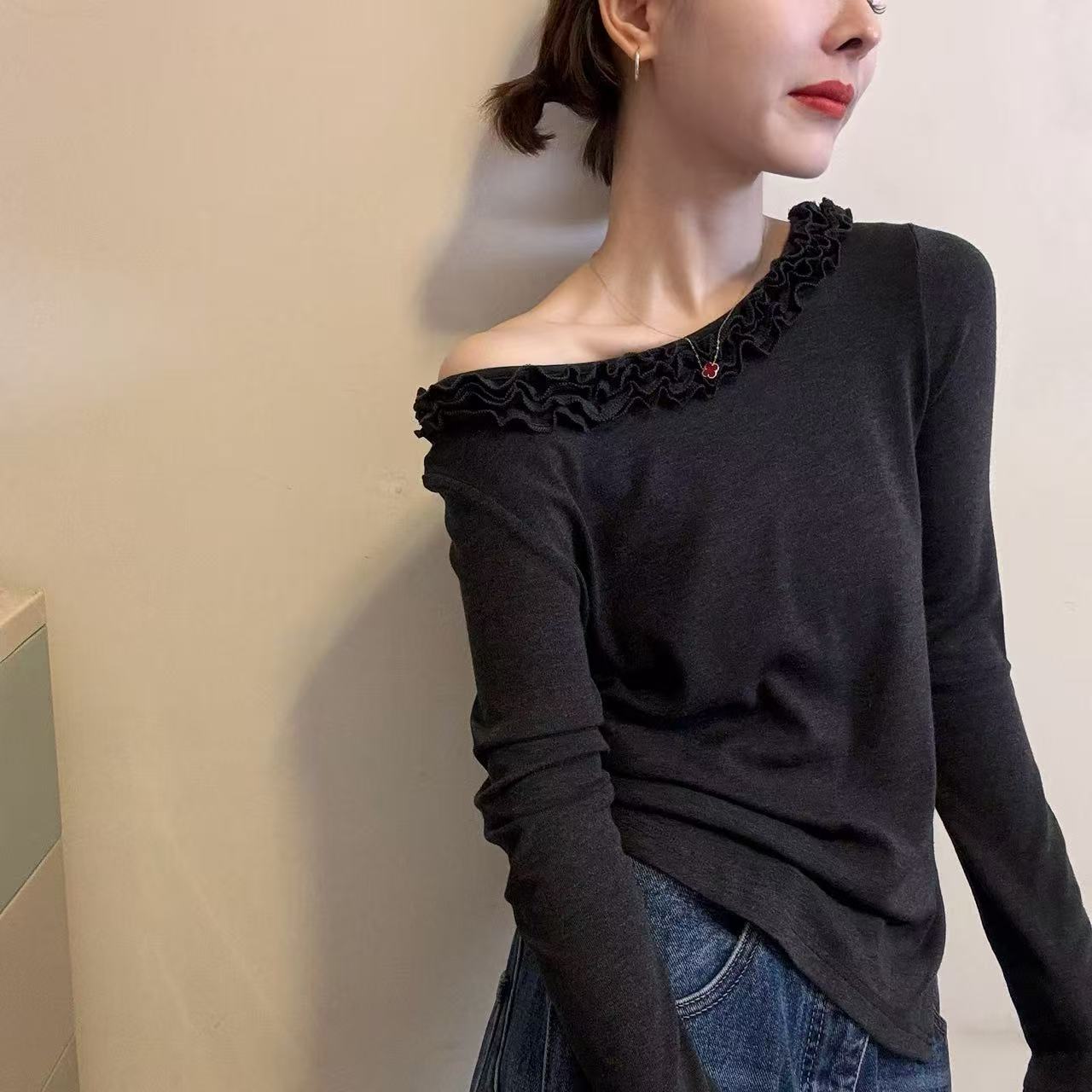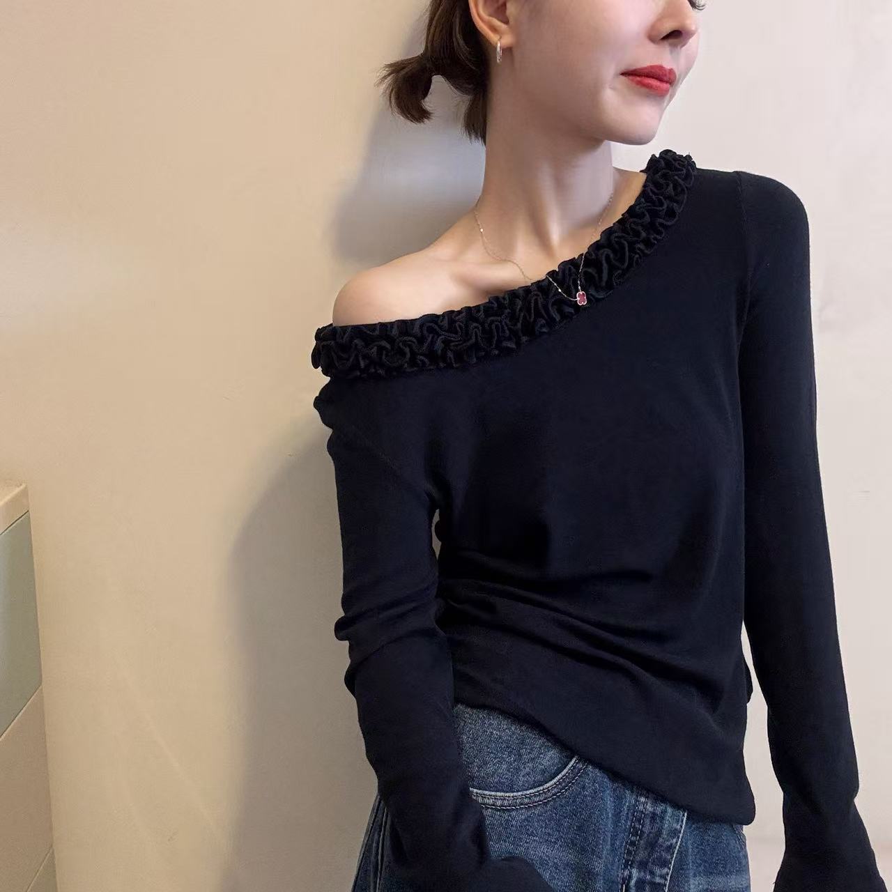 欧洲站2025秋季时尚斜肩立体花朵设计一字领长袖T恤洋气露肩上衣
