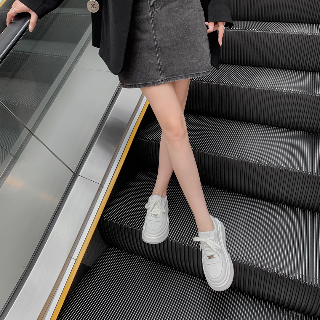 【胡可推荐】苏茵茵~系带真皮休闲运动厚底毛毛小白鞋女板鞋