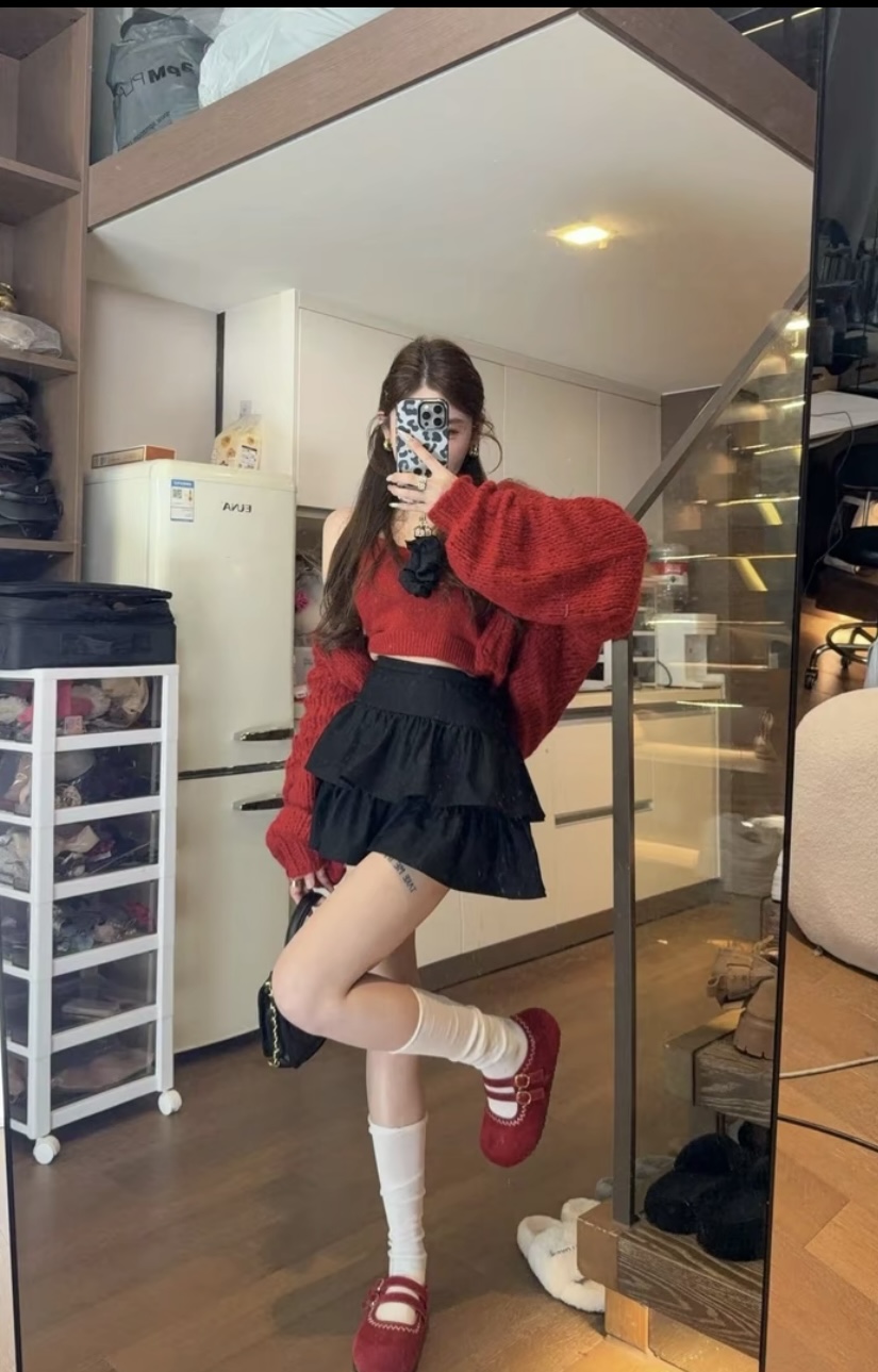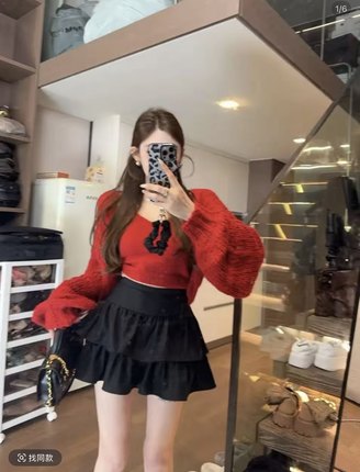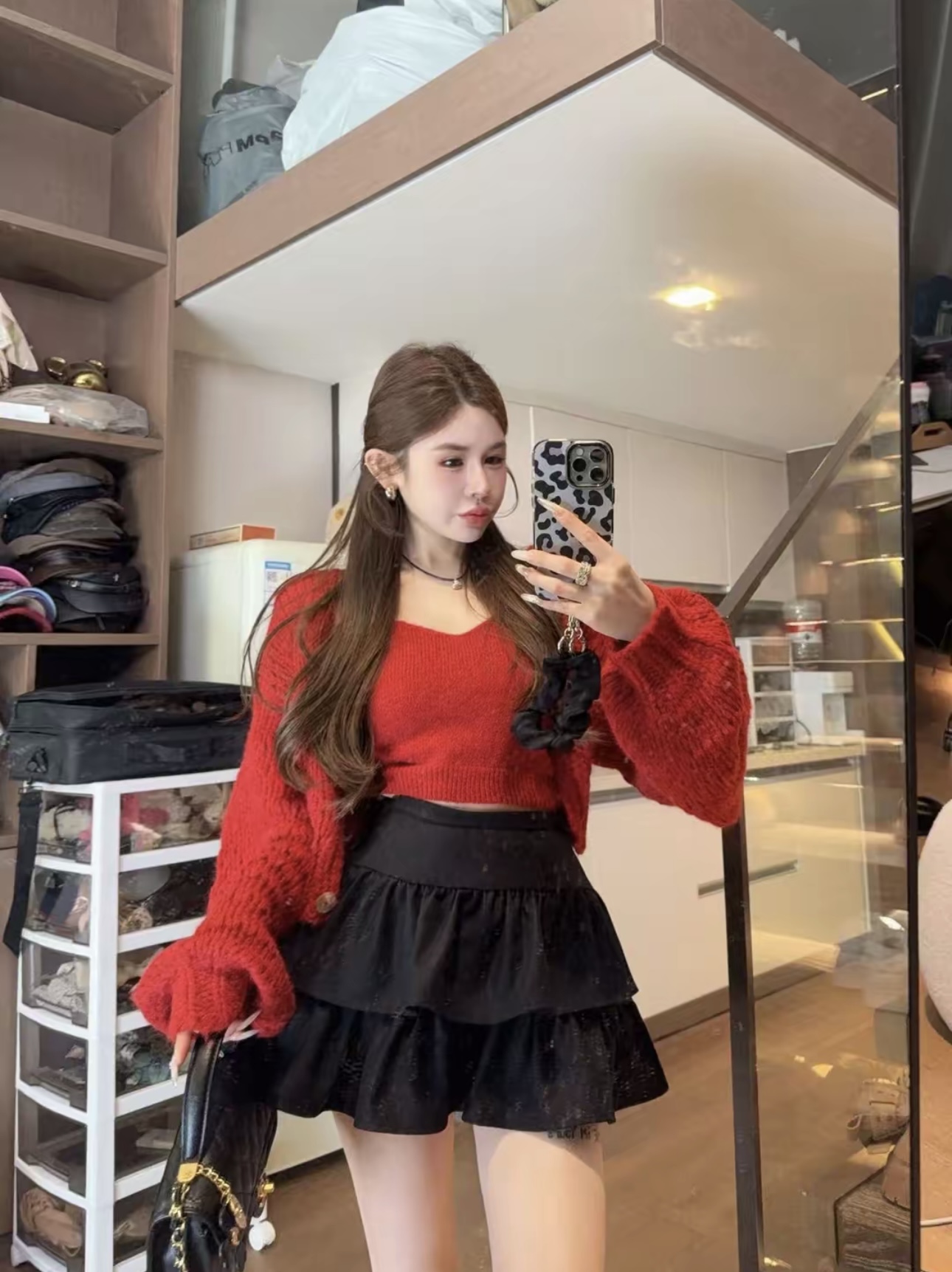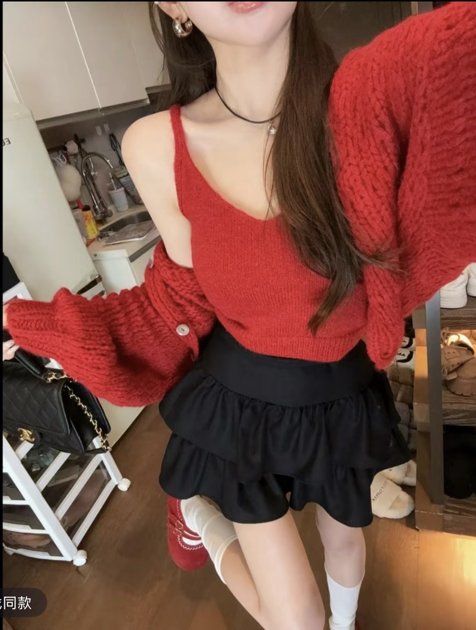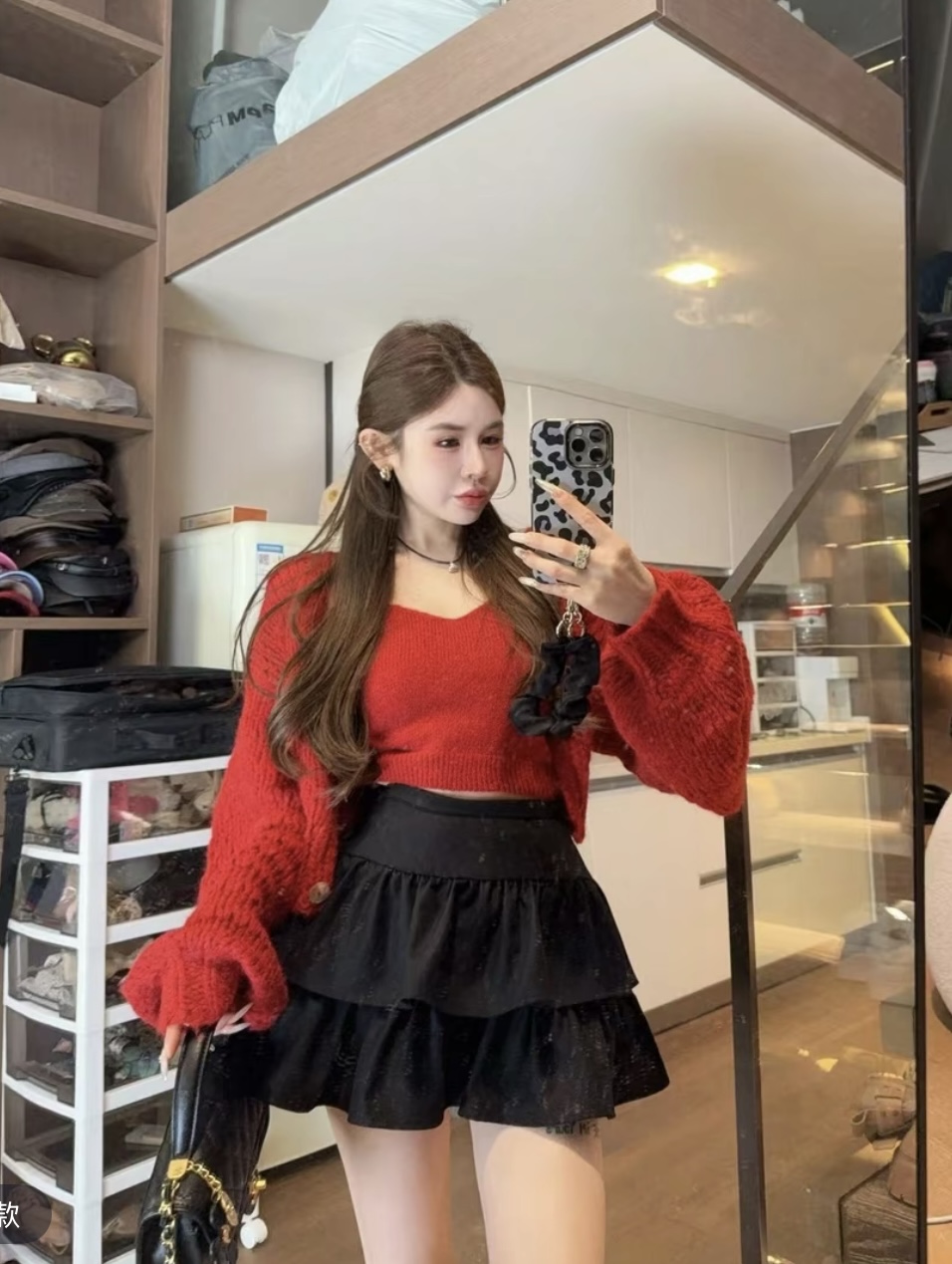 泡菜订制红色钩花针织毛衣2025秋季新款韩系百搭显瘦开衫外套上衣