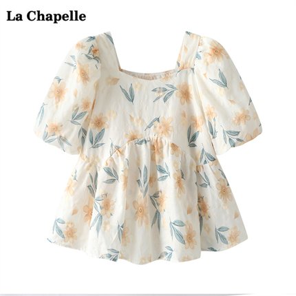 拉夏贝尔/La Chapelle夏季新款方领泡泡袖碎花衬衫女短袖小衫上衣