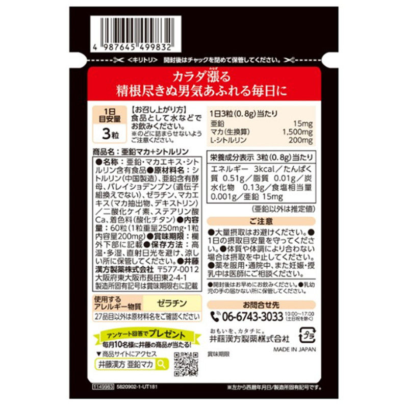 日本代购井藤汉方亚铅+玛咖胶囊60粒ITOH玛卡精华+锌+L瓜氨酸正品