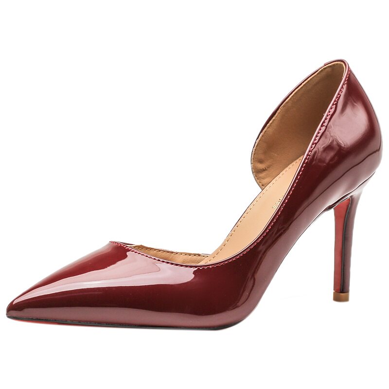2026年新款尖头高跟鞋女细跟职业通勤漆皮性感酒红色侧空婚鞋单鞋
