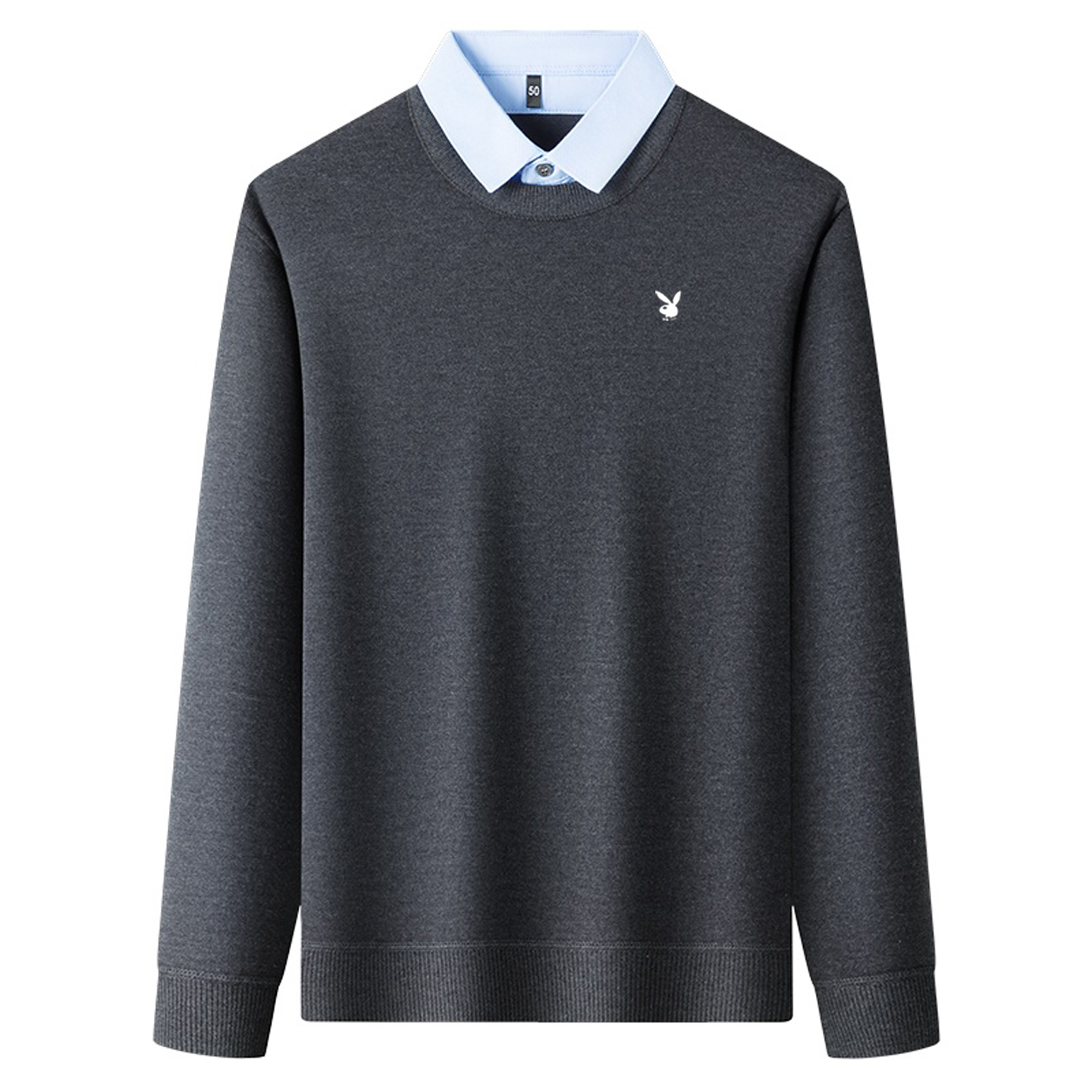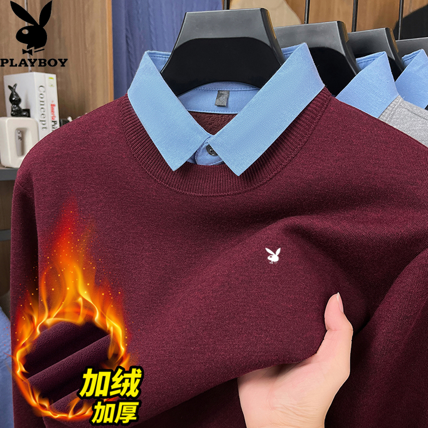 花花公子加绒加厚羊毛衫男士衬衫领假两件毛衣冬季保暖针织打底衫