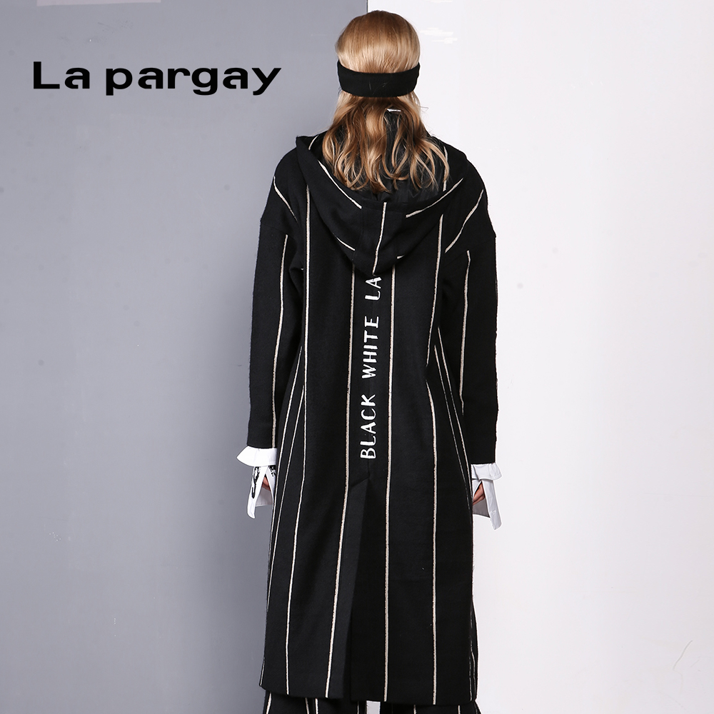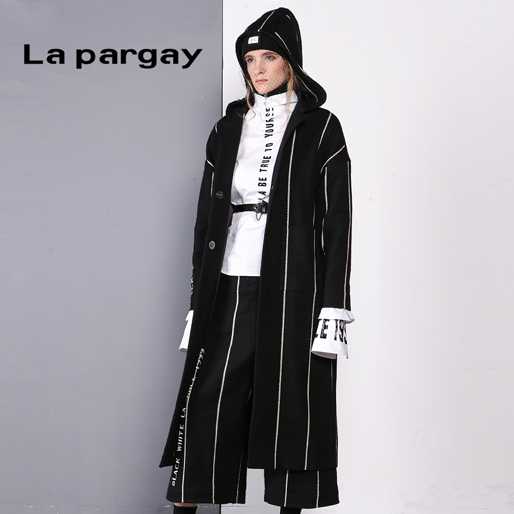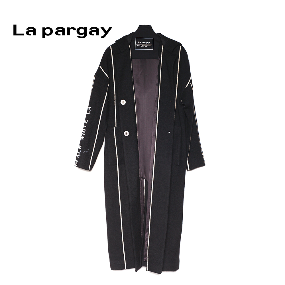 Lapargay纳帕佳新款女装秋季黑色风衣中长款立体条纹大衣外套