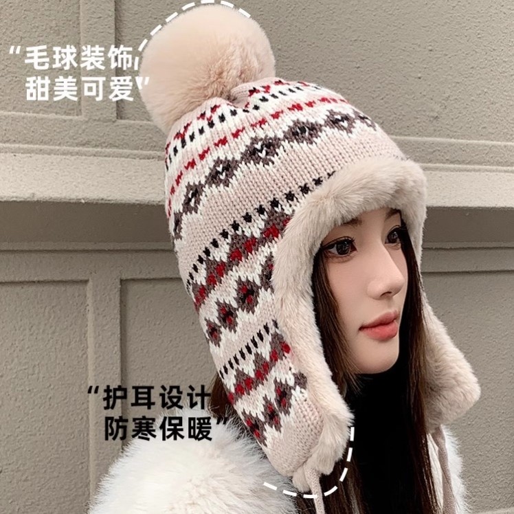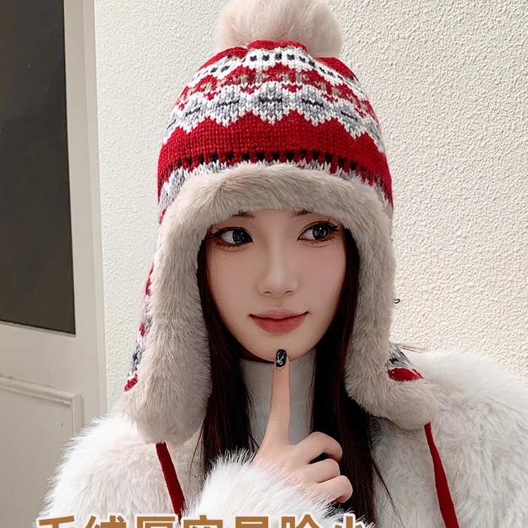 加绒加厚毛线帽子女秋冬韩版显脸小保暖骑行护耳防寒大头围雷锋帽