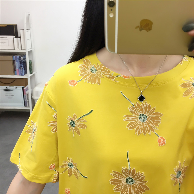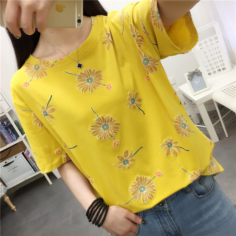 新款2022夏季印花宽松圆领白色t恤黄色少女上衣休闲ins体恤潮短袖