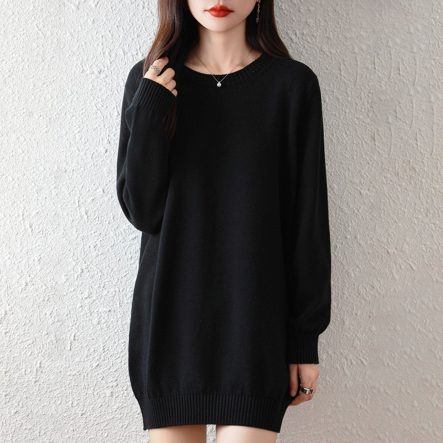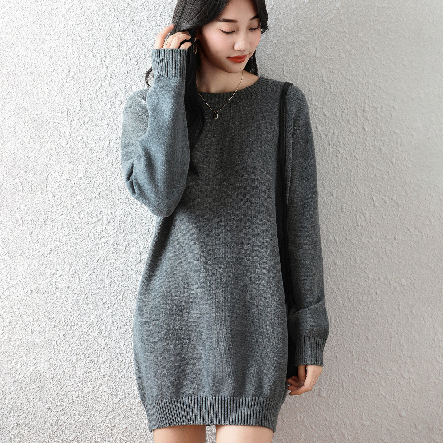 秋冬新款简约风圆领纯棉线针织连衣裙女中长款宽松显瘦打底毛衣裙