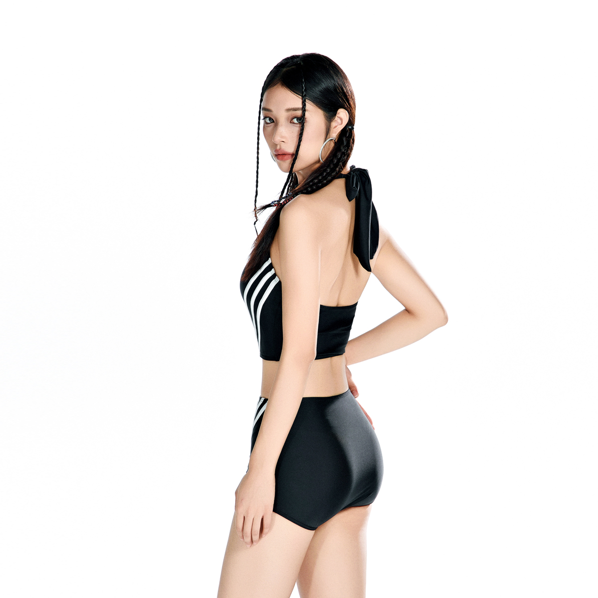 泳衣女士高领无袖高级感小胸聚拢黑白条平角泳裤套装泡温泉游泳