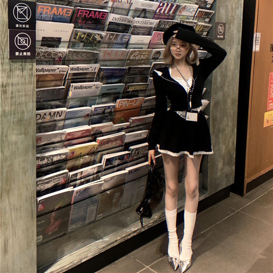 蕾丝拼接连帽短款卫衣外套女春秋纯欲套装a字半身裤裙灰色两件套