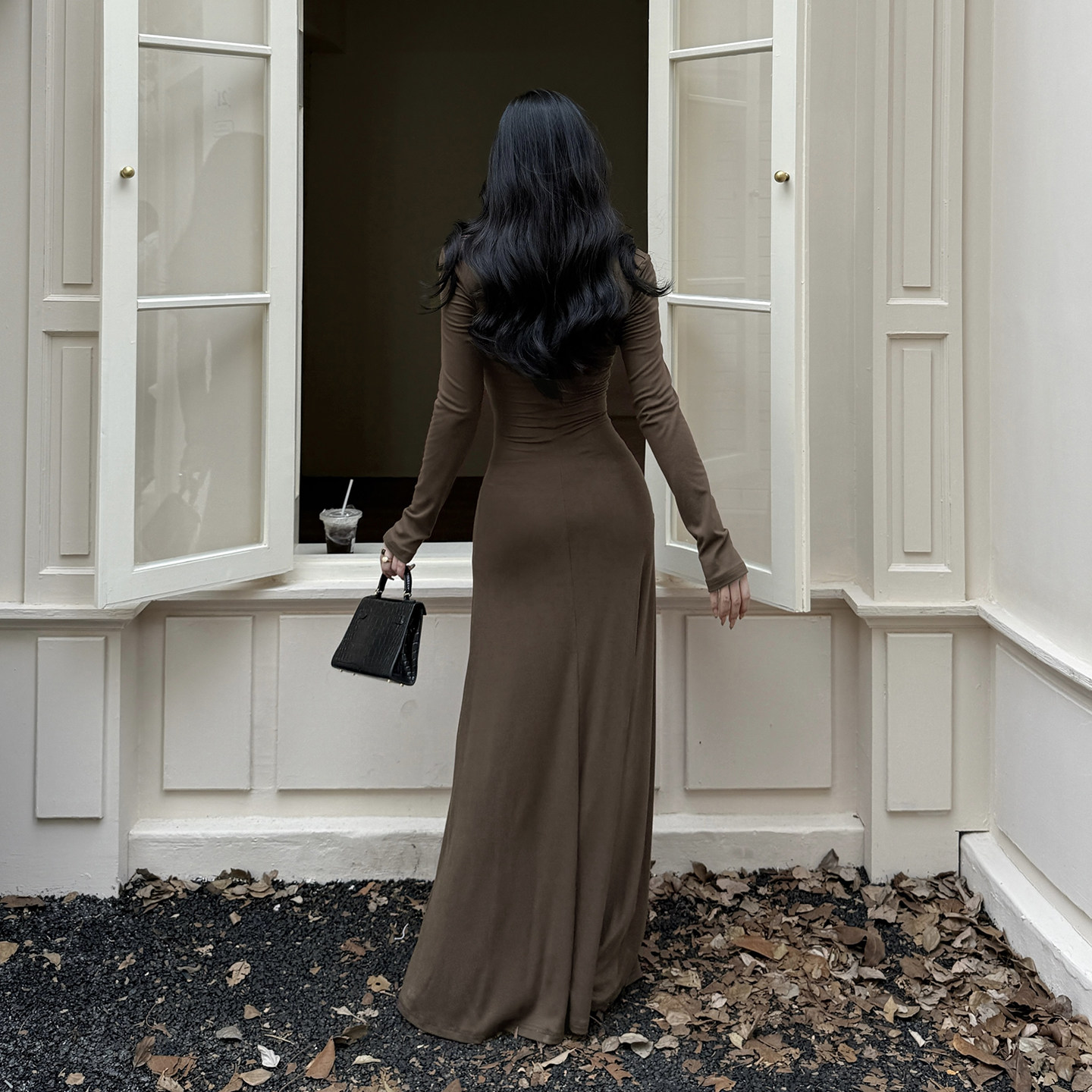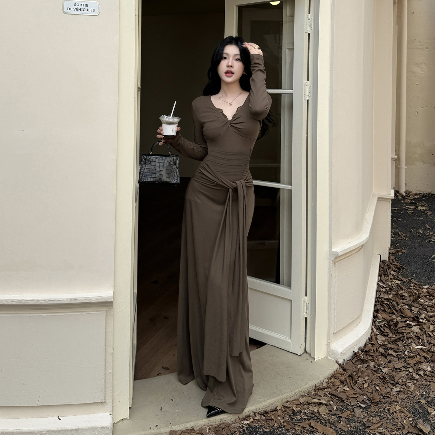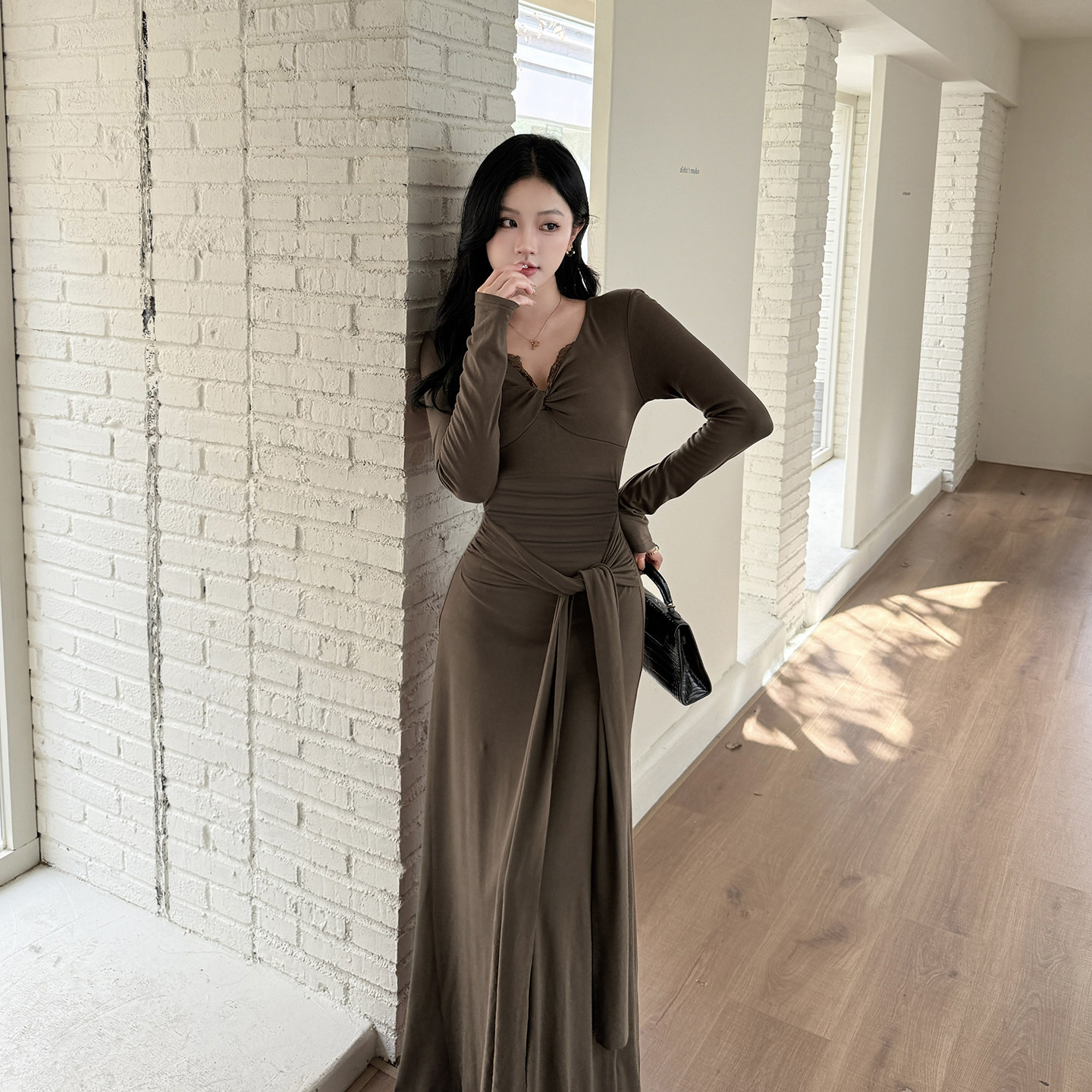 GirlsAt18 性感蕾丝拼接扭结长袖连衣裙女秋季新款高级感收腰长裙