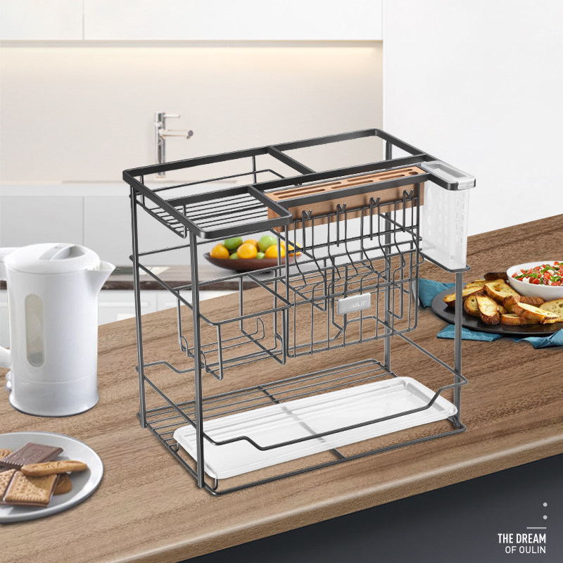 欧琳厨房橱柜拉篮 黑色不锈钢抽屉式碗架碗篮双层碗碟调味篮阻尼