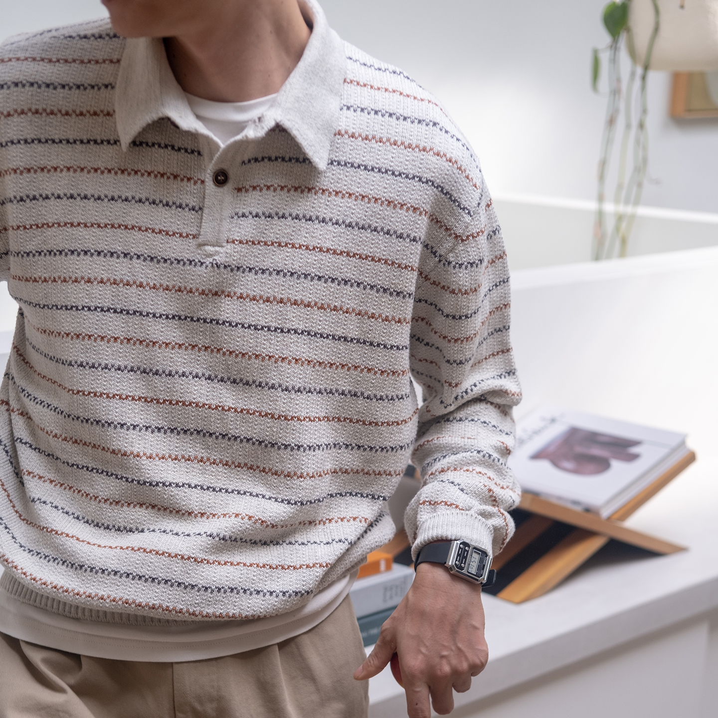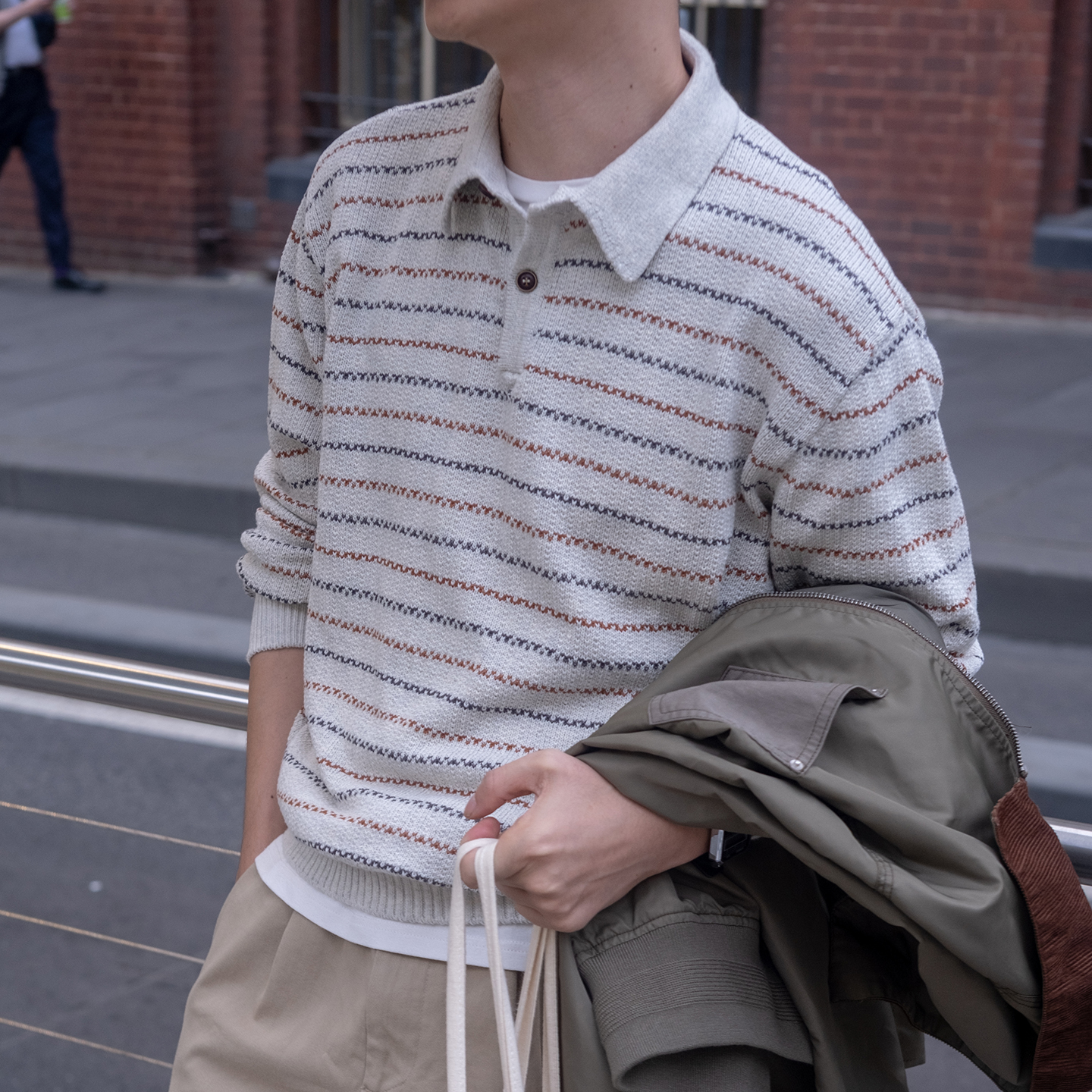 【彩色波浪线】几立 彩色细条纹polo领宽松短款毛衣薄款针织衫