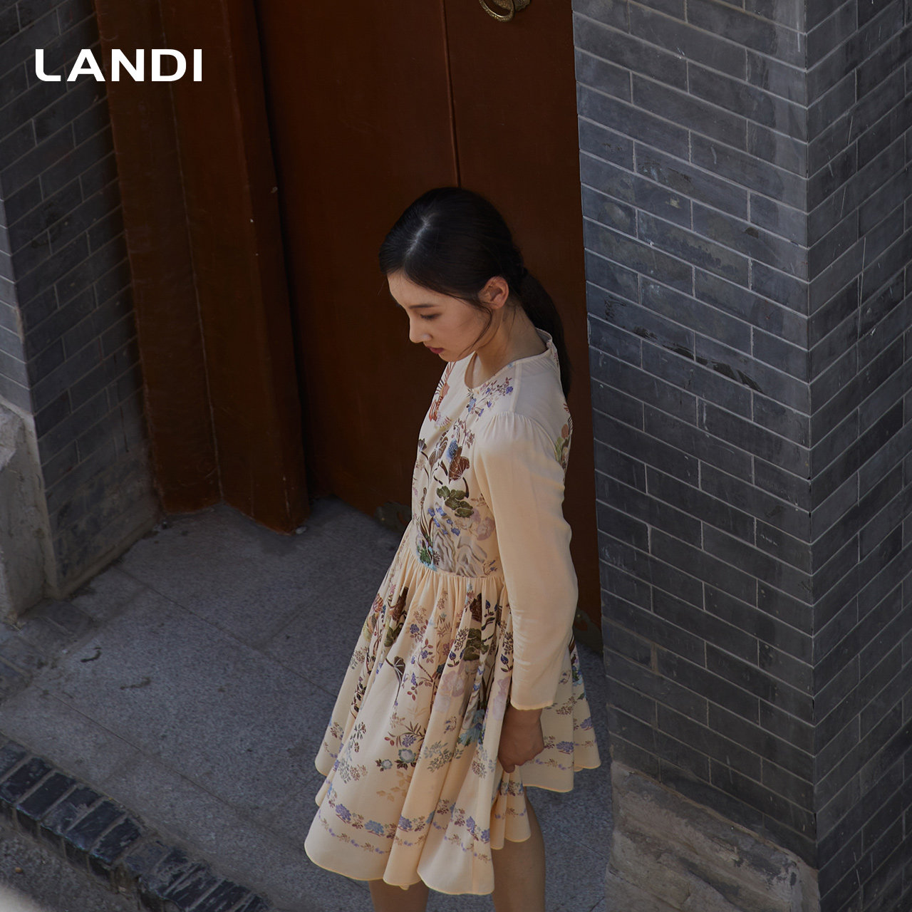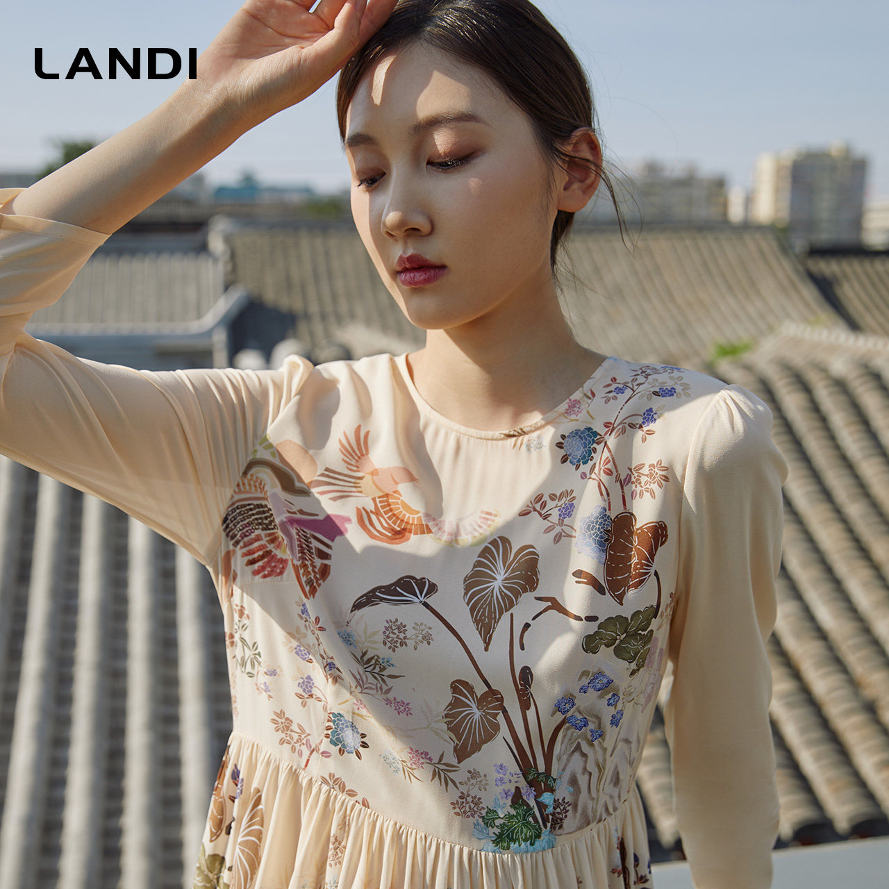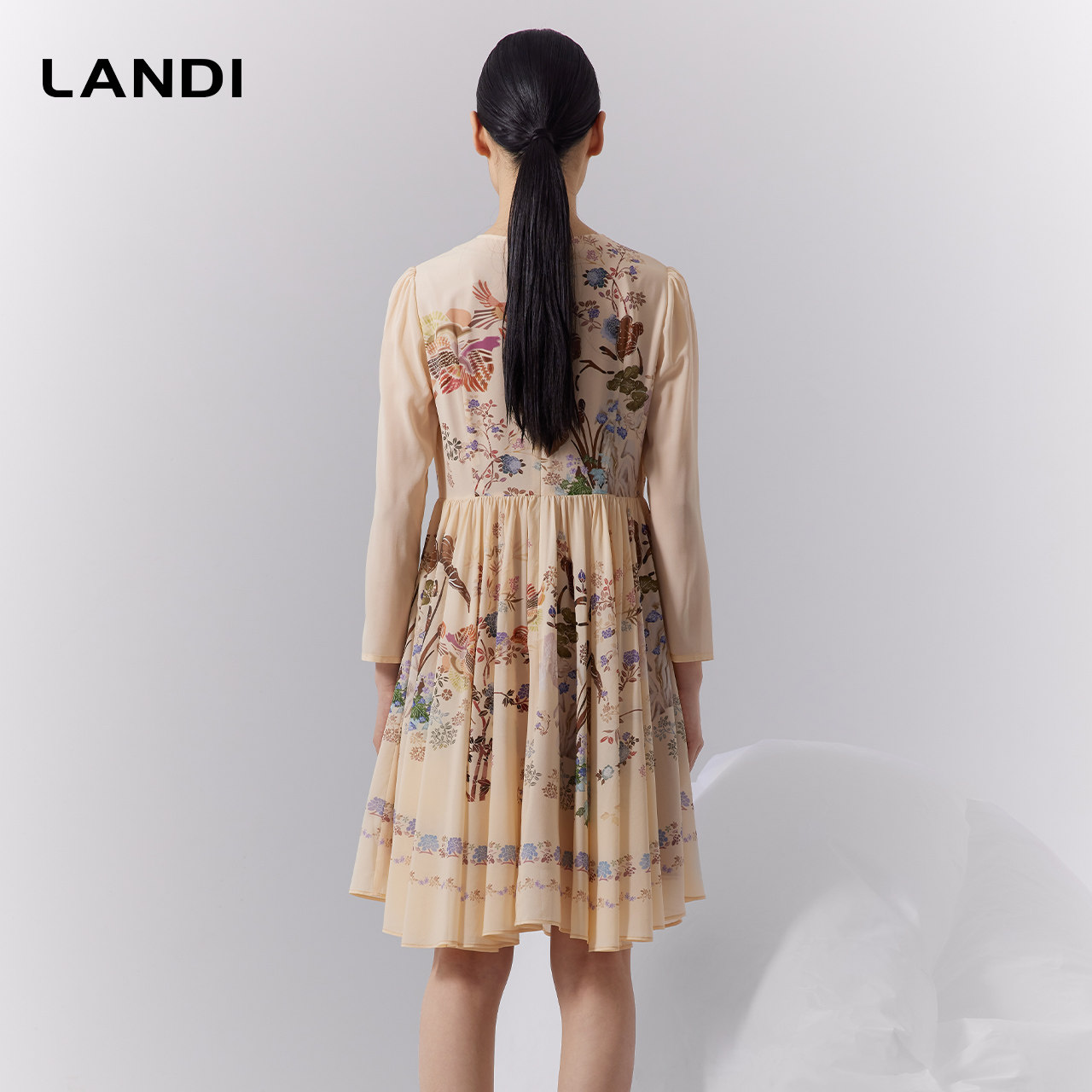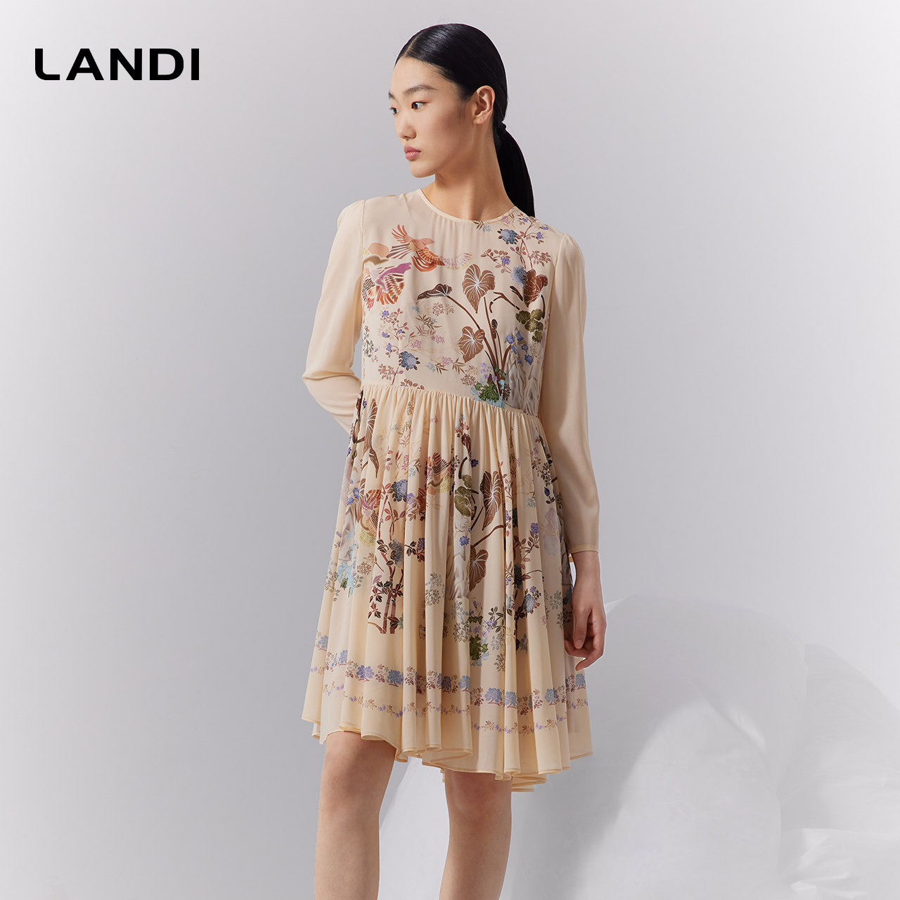 LANDI蓝地米色圆领真丝国风印花拼接连衣裙女桑蚕丝百褶裙秋新品