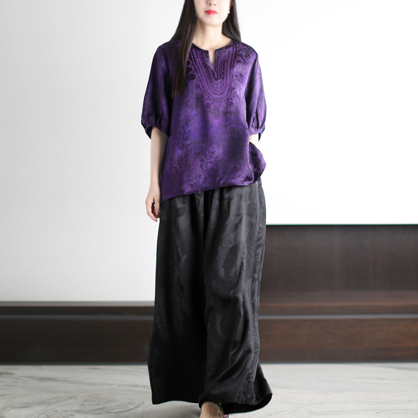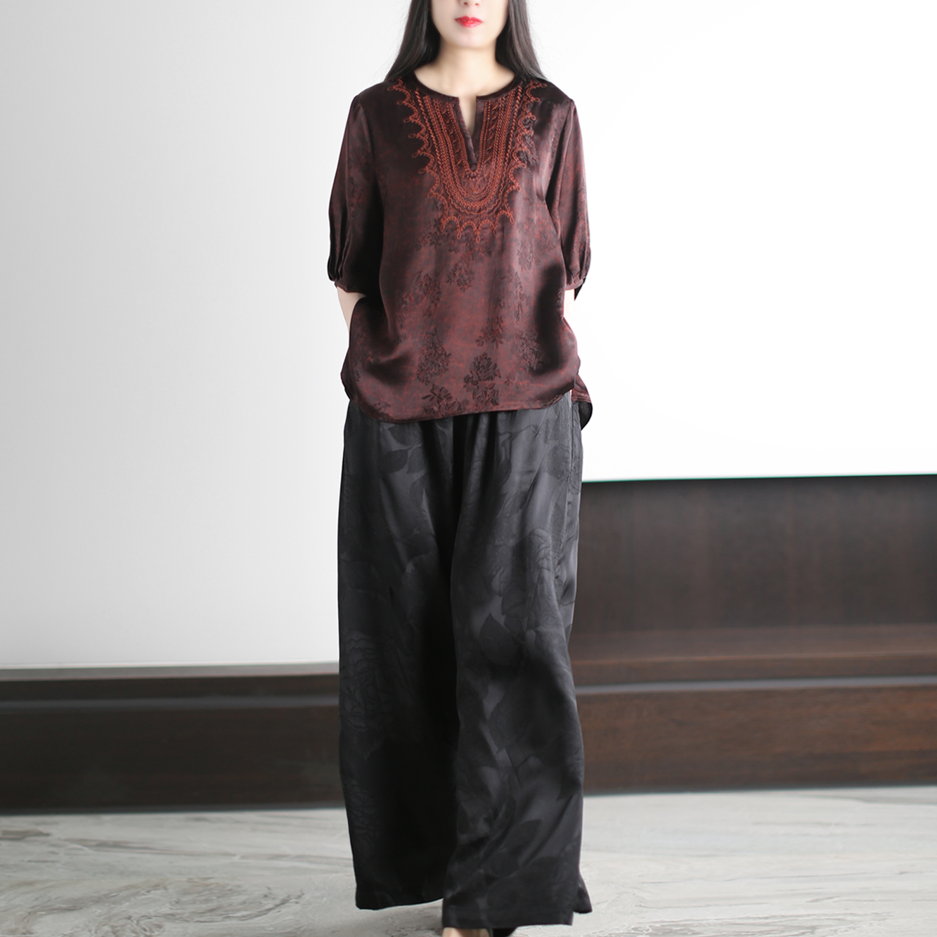 兮风品牌复古刺绣花香云纱上衣+阔腿裤025夏季高端雅奢提花套装女