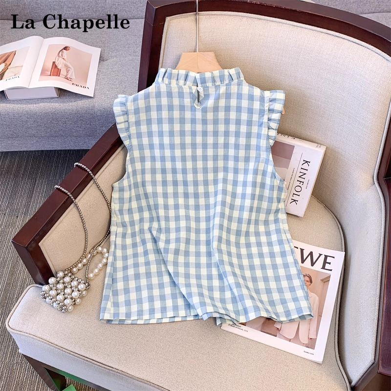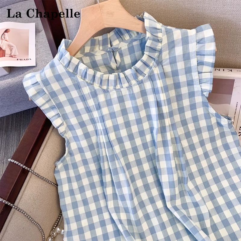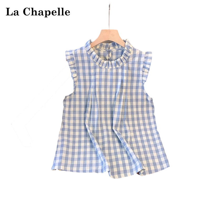 拉夏贝尔蓝色格子小飞袖背心衬衫女夏季宽松显瘦木耳边短款上衣