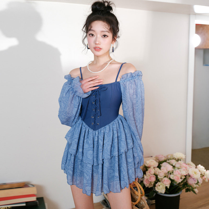 泳衣女连体裙式微胖mm大码平角裤温泉2023新款遮肉显瘦长袖一字肩
