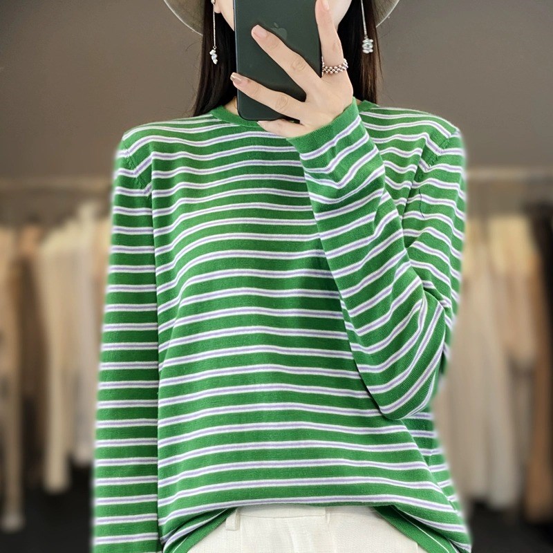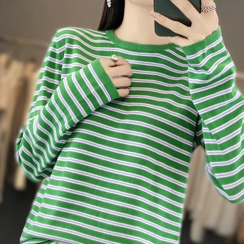 早秋新款纯棉线条纹长袖针织打底衫女圆领宽松 百搭洋气上衣毛衣