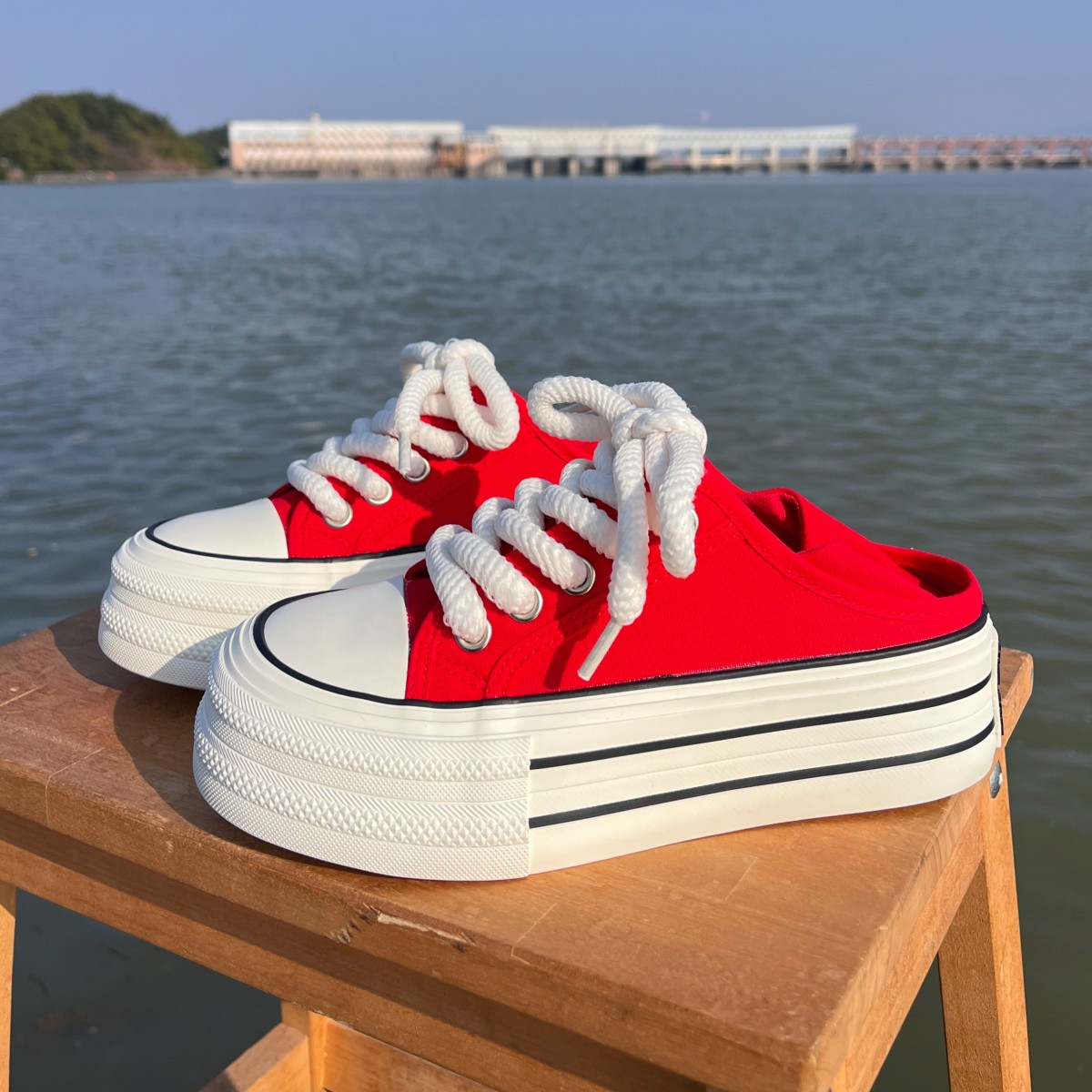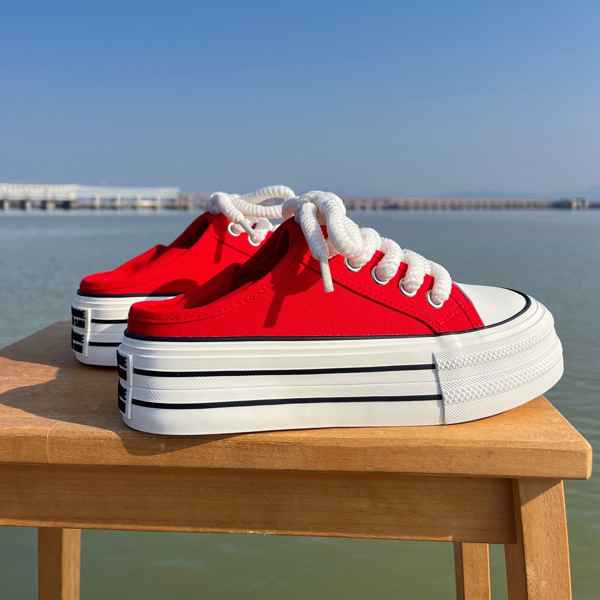 红色两穿厚底增高帆布鞋女2025春季新款透气一脚蹬半拖鞋松糕板鞋