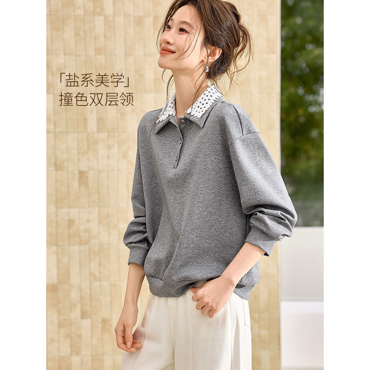 沫晗依美撞色拼接双层领上衣2026春季新款休闲学院显瘦百搭卫衣女