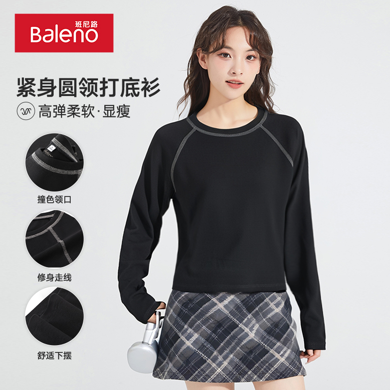 班尼路杏色插肩袖长袖T恤女2025春季新款休闲圆领打底修身上衣Q