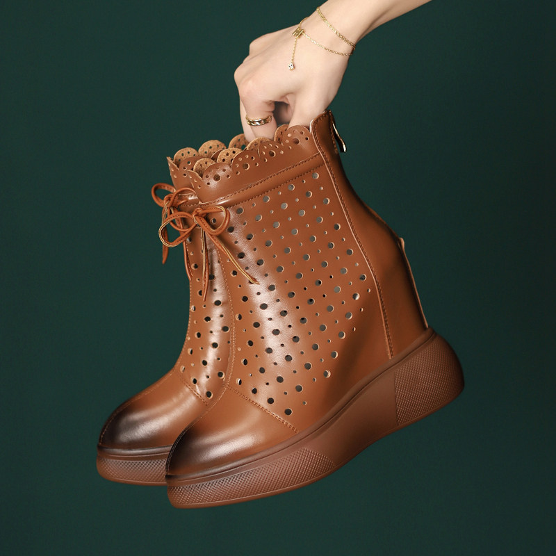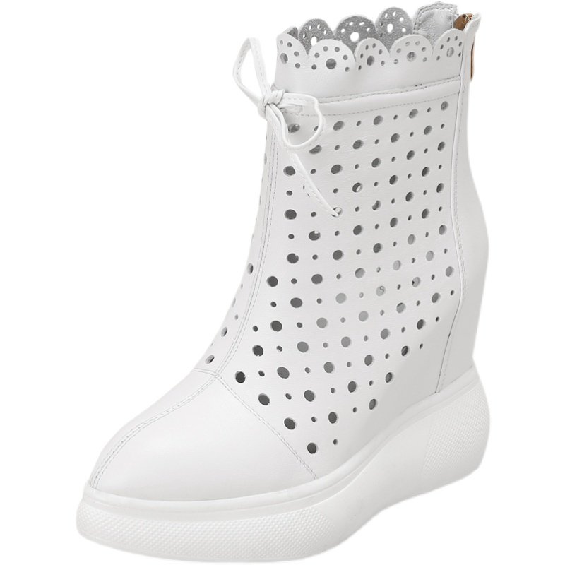 12cm内增高女靴子镂空凉靴夏季薄款白色短靴厚底高跟真皮春秋单靴