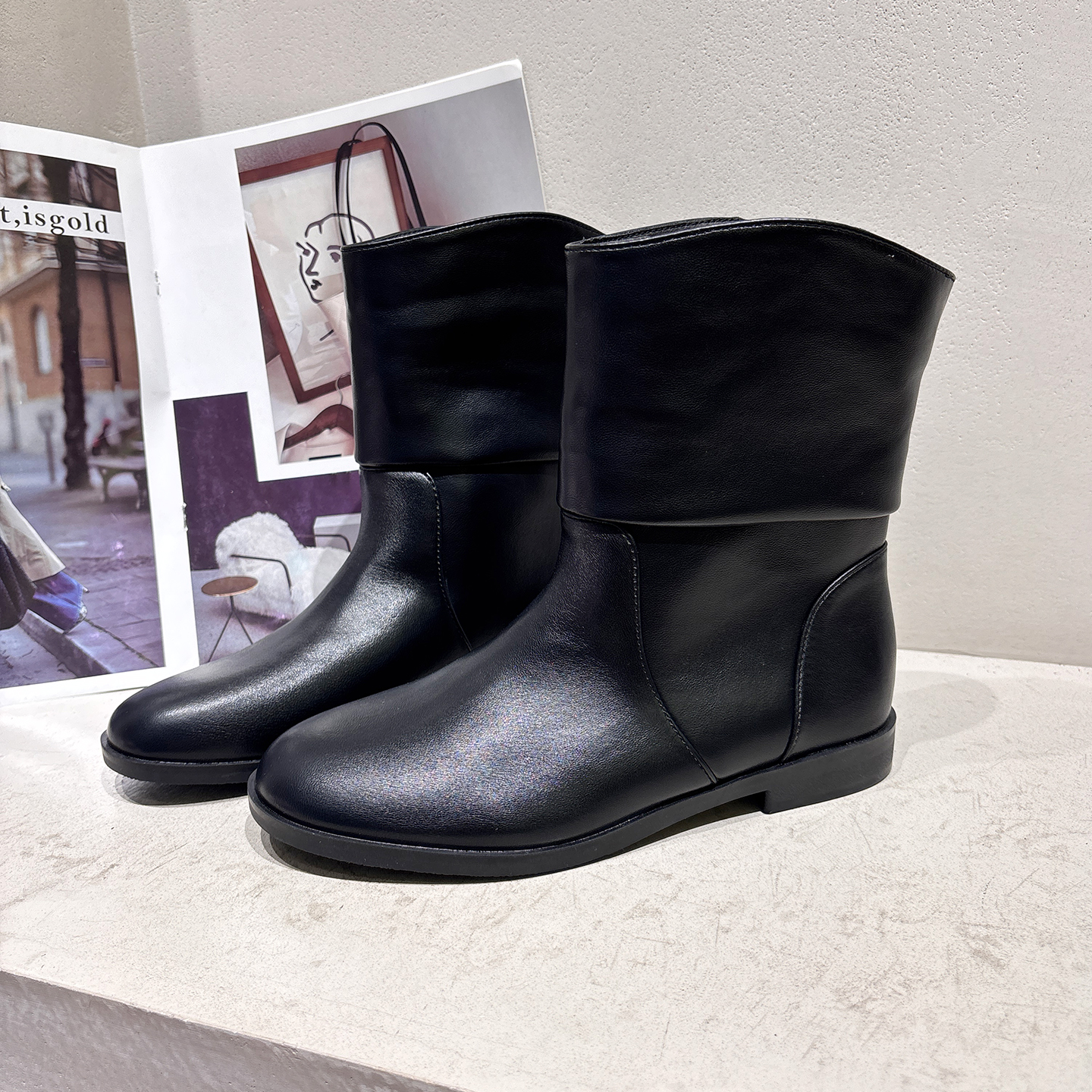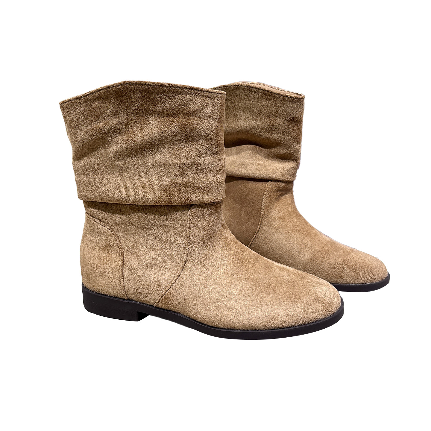 套筒低跟褶皱堆堆靴舒适粗跟短靴