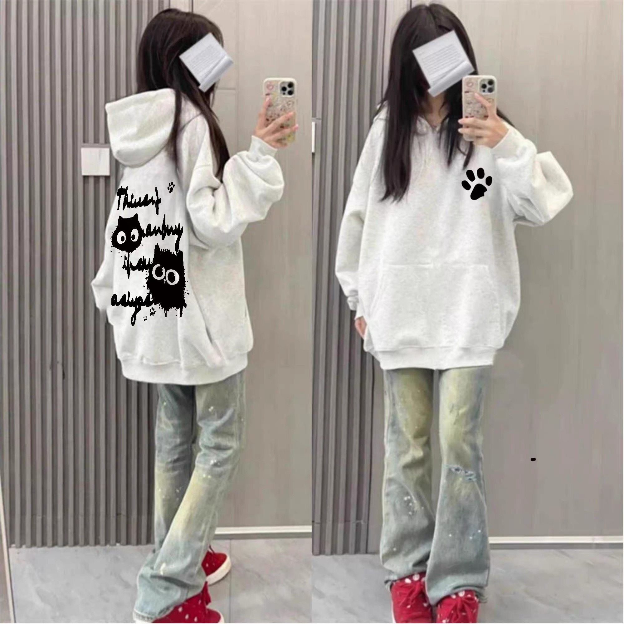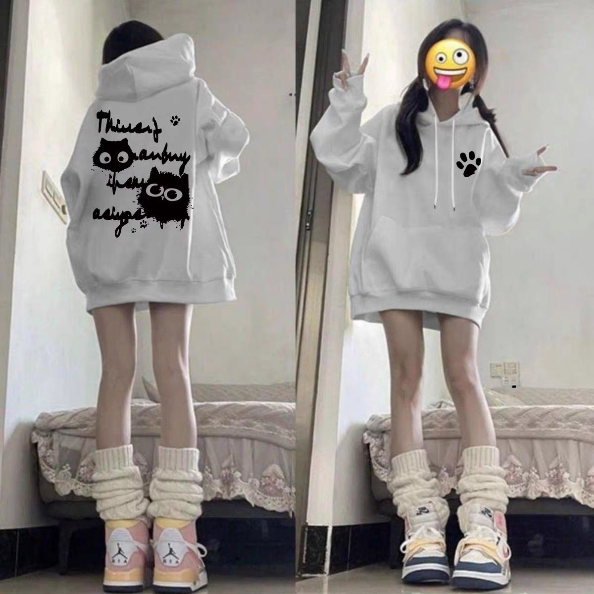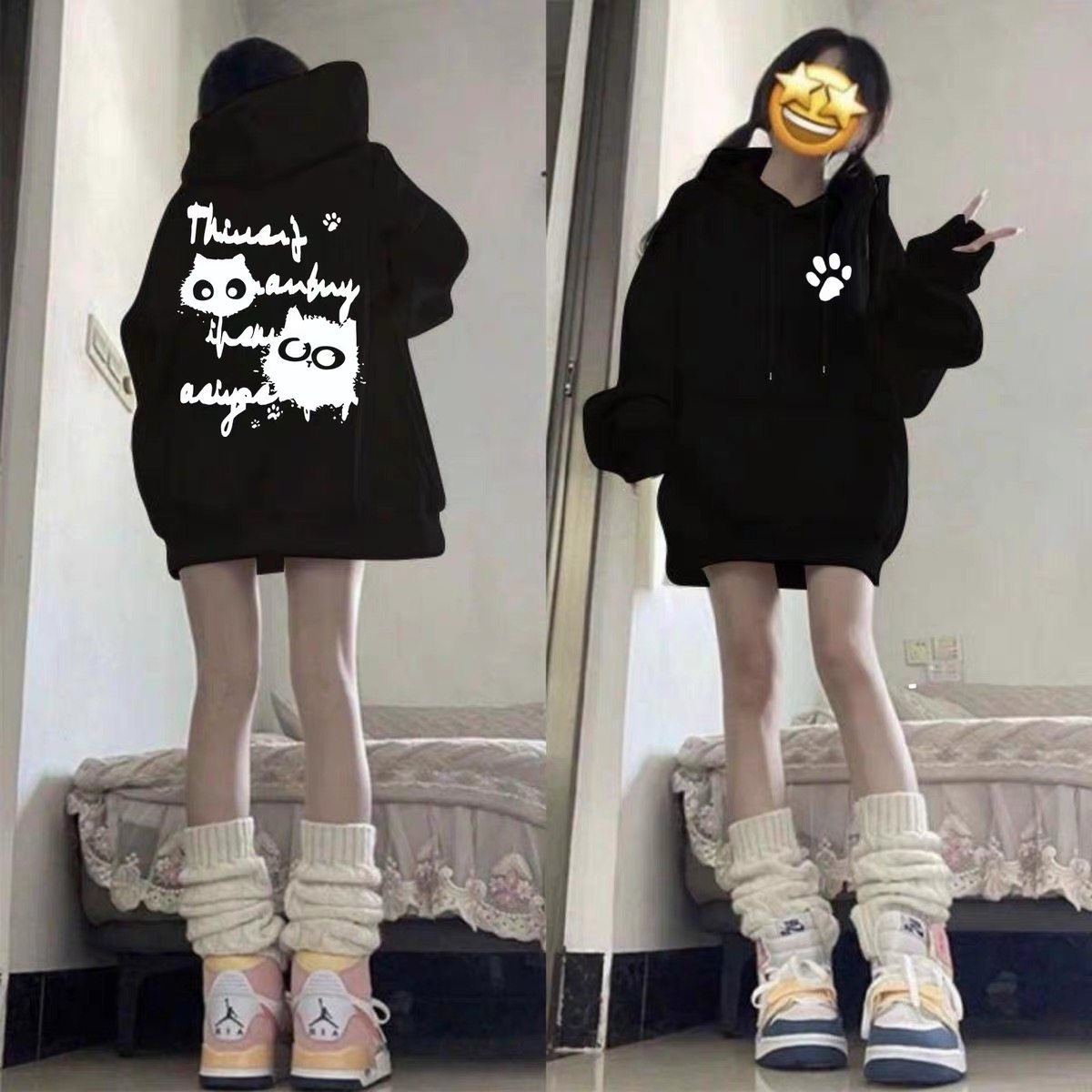 女童美式字母猫咪印花连帽卫衣初中生秋冬季加绒宽松学生上衣外套